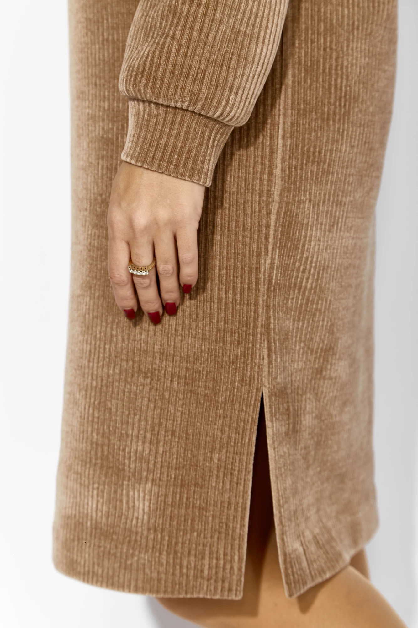 Платье женское, прямого силуэта с длинным рукавом. Рукав со спущенной линией плеча, по низу на манжете. Горловина оформлена высокой, мягкой стойкой. По боку разрез, акцентирован декоративной сточкой. Спинка без особенностей