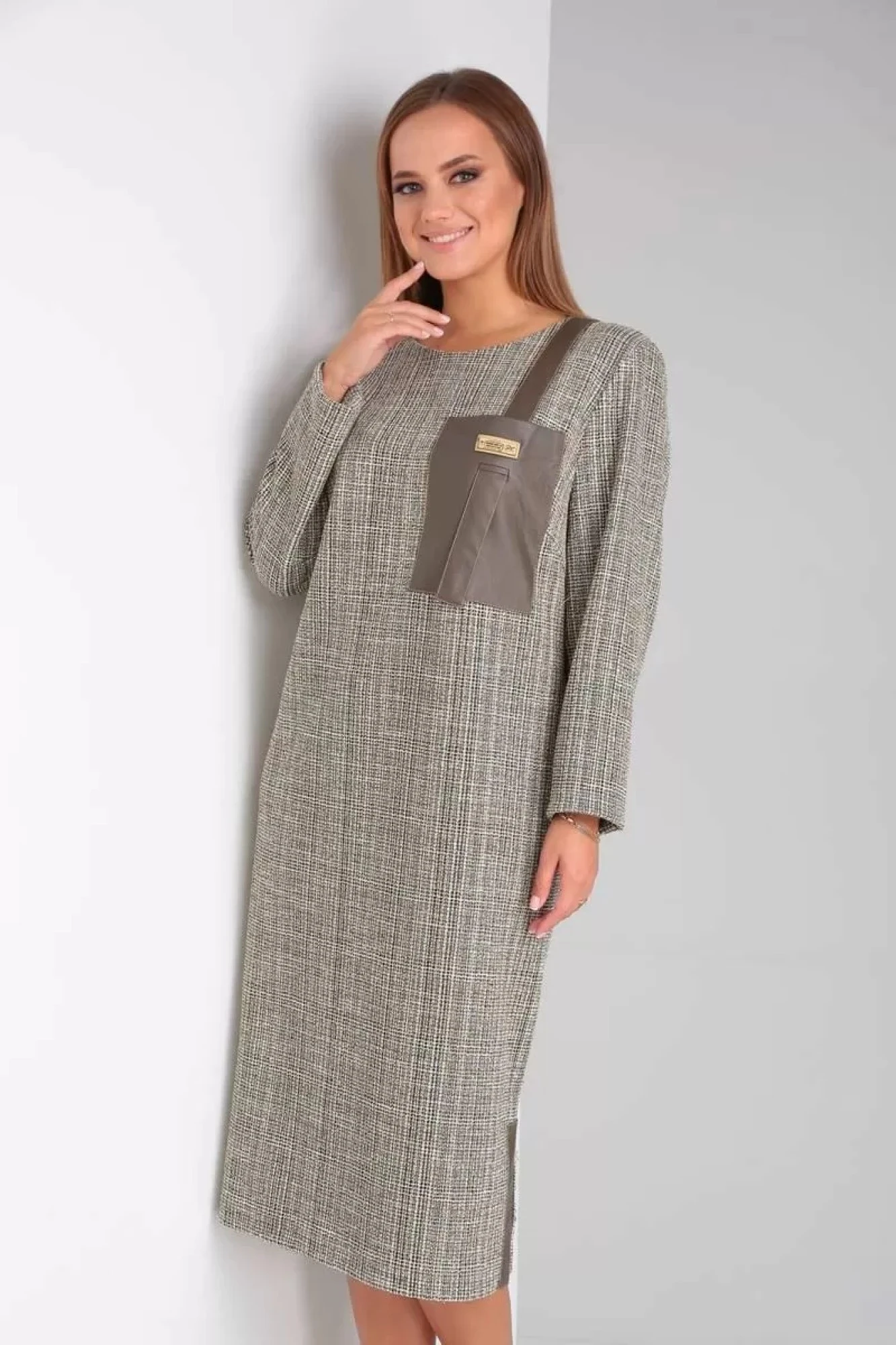 Платье женское прямого свободного силуэта из трикотажного полотна с деталями из экокожи. По переду горловина округлой формы; слева нагрудный карман с петлёй, через которую проходит пата, выходящая из плечевого шва. По спинке: средний шов, по центру от горловины вниз молния. По бокам внизу разрезы с отделкой. Рукав втачной прямой длинный, заужен книзу.