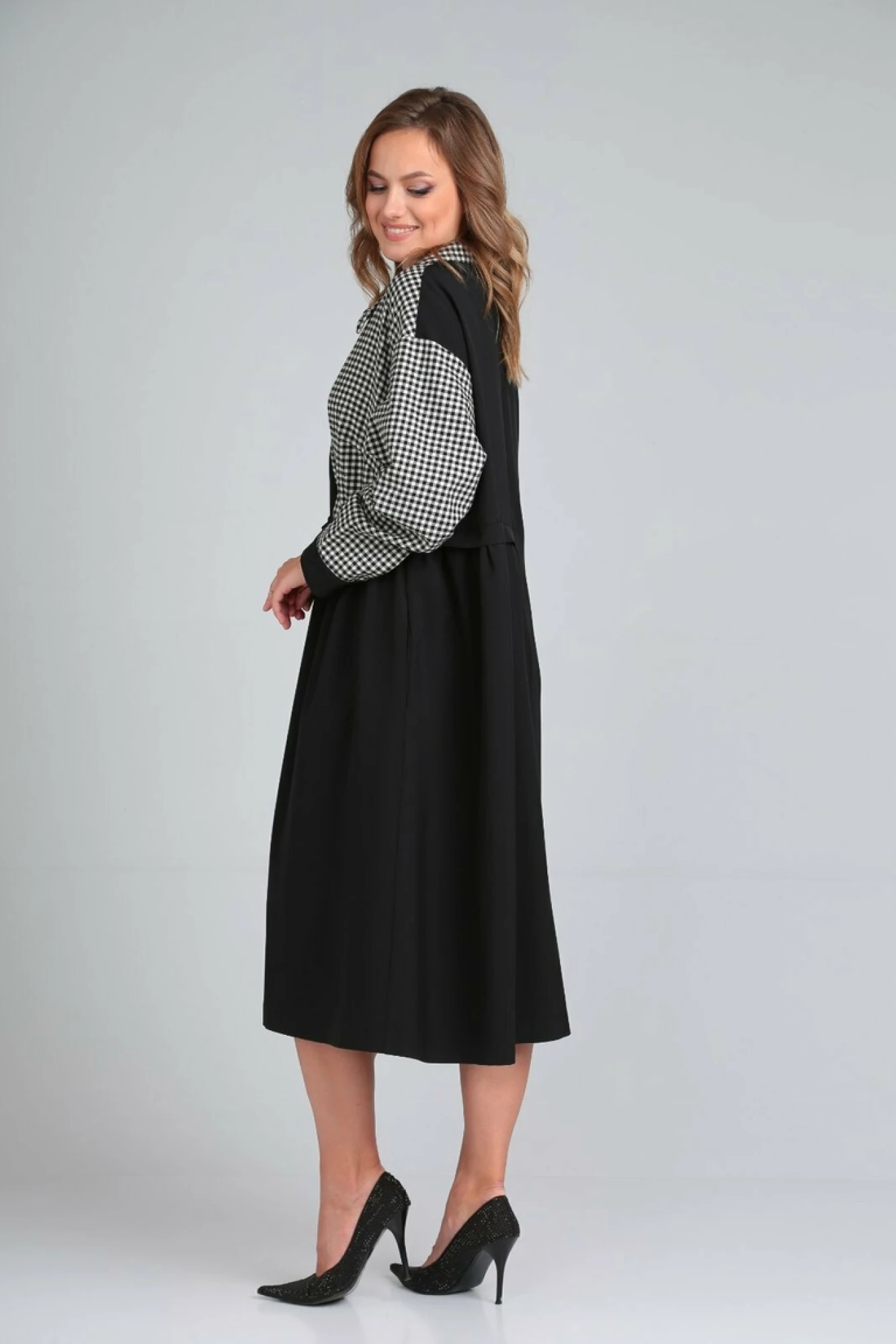 Платье свободного силуэта в стиле «бохо», выполнено из двух тканей-компаньонов. Воротник отложной, застежка - центральная потайная молния до линии талии. Перед платья ассиметричный - правая половинка цельнокроеная, левая - отрезная по линии талии, нижня часть лифа с кулисой и фиксатором. Линия плеча спущена, рукав рубашечный на манжете с пуговицей. Спинка ассиметрична, со средним швом: правая часть цельнокроеная, левая-отрезная по линии талии. В боковых швах потайные карманы.