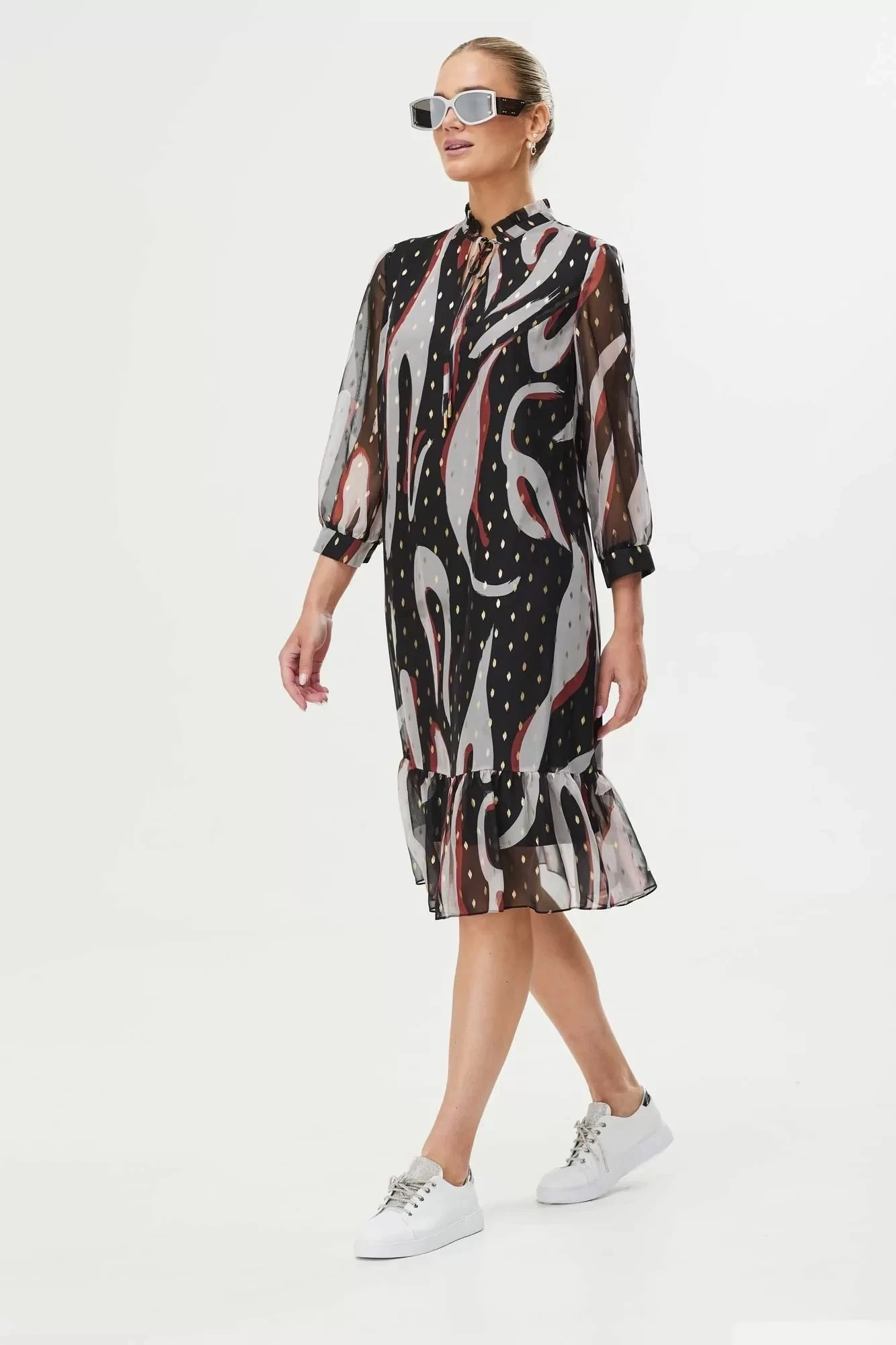 Восхитительное платье расширенного силуэта к низу из шифона отличается особой легкостью и не сковывает движений. Элегантная модель со стильным принтом будоражит воображение, вызывает интерес. В таком платье невозможно остаться незамеченной!