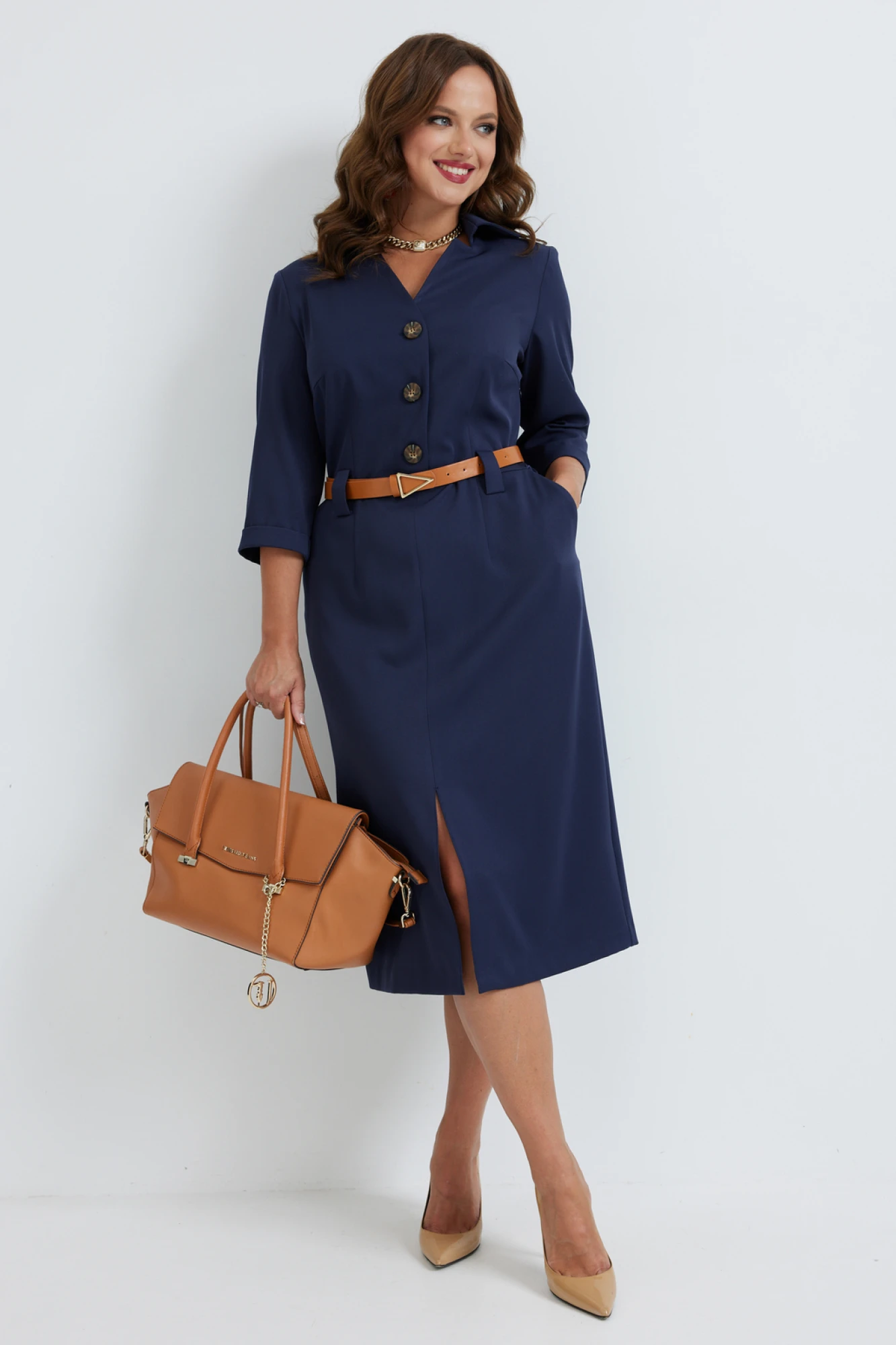 Платье полуприлегающего силуэта, выполненное из плательной поливискозы, длиной 'мидакси"". Платье отрезное по линии талии, с центральной застёжкой на петли и пуговицы. Верхняя часть переда платья с фигурной V-образной горловиной, оформленной воротником рубашечного типа. Верхняя часть платья с нагрудными и талиевыми выточками. Нижняя часть переда платья с талиевыми вытачками и со средним швом, внизу которого обработан разрез. Спинка цельнокроеная с талиевыми вытачками. В боковом шве обработана потайная молния в области талии, в области бедер обработаны карманы. Рукав втачной, с цельнокроеной манжетой, длиной 3/4. В комплект к платью входит контрастный ремень с декоративной пряжкой.