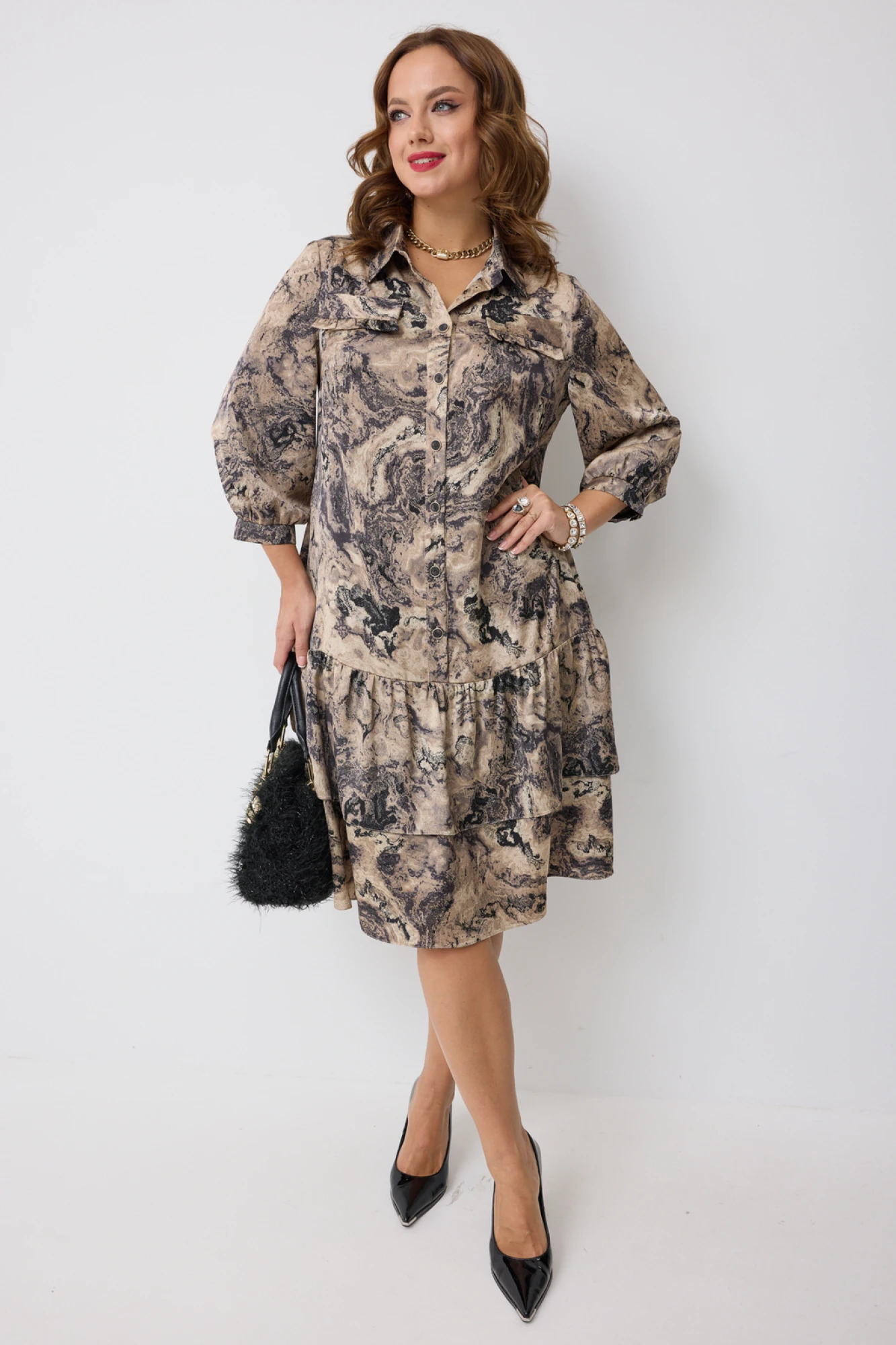 Платье, выполненное из вискозной плательной ткани, длиной миди, свободного кроя. Горловина платья оформлена воротником рубашечного типа. Перед платья с центральной застёжкой на петли и пуговицы, расположенной до линии бедер. По переду обработаны нагрудные вытачки. В области груди - настрочные декоративные клапаны, с рюшами. Нижняя часть платья состоит из двух воланов. В боковых швах обработаны карманы. Рукав втачной одношовный, длиной 3/4, низ рукава на притачной манжете, которая застёгивается на петлю пуговицу. Верхняя часть спинки цельнокроеная, нижняя, как и перед платья, состоит из 2-х воланов.
