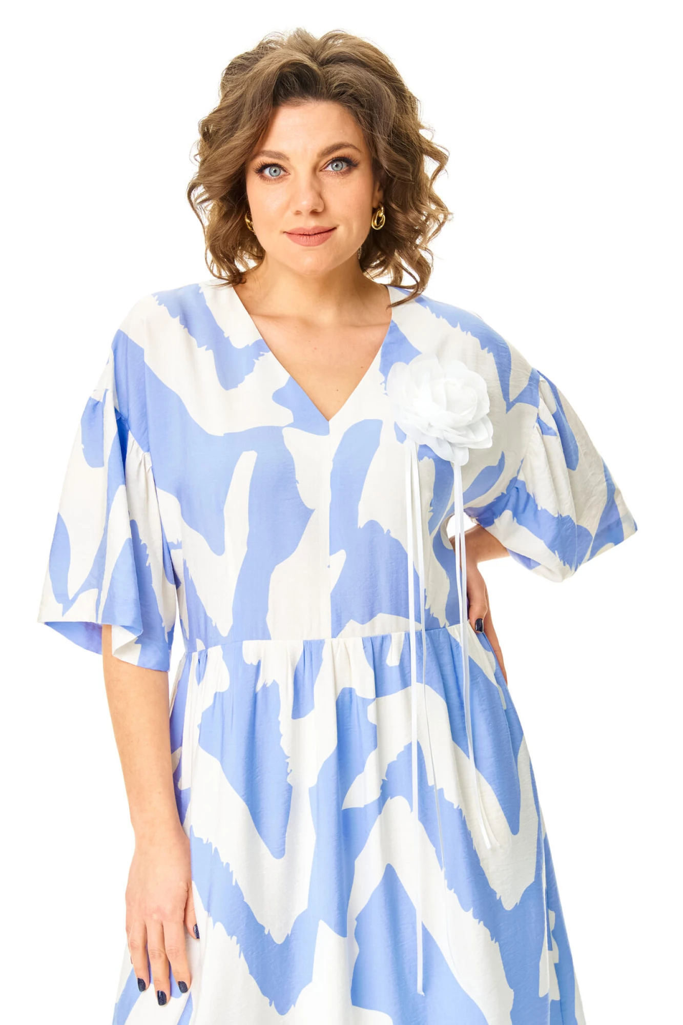 Платье женское А-образного силуэта со спущенной линией плеча.По окату рукава обработана сборка.Горловина V-образной формы.В среднем шве спинки застежка на тесьму-молнию.Перед и спинка выполнена последовательными оборками создающими легкое расклешение низу.В боковых швах обработаны карманы.В комплект входит съемная брошь в виде цветка.