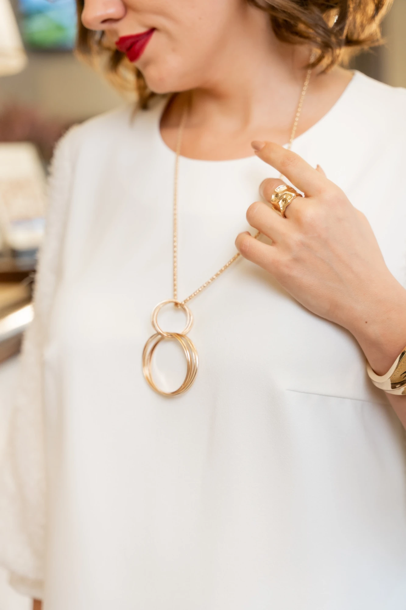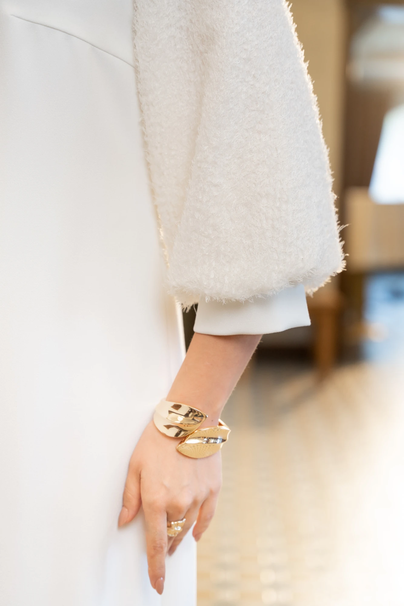 Платье А-образного силуэта с естественной линией плеча.Спинка со средним швом и застежкой на молнию.Перед с нагрудными вытачками.Вырез горловины округлой формы.Рукав втачной одношовный длиной 3/4 из отделочной ткани "реснички" типа "баллон" с манжетой по низу.В комплект к платью входит декоративная подвеска.