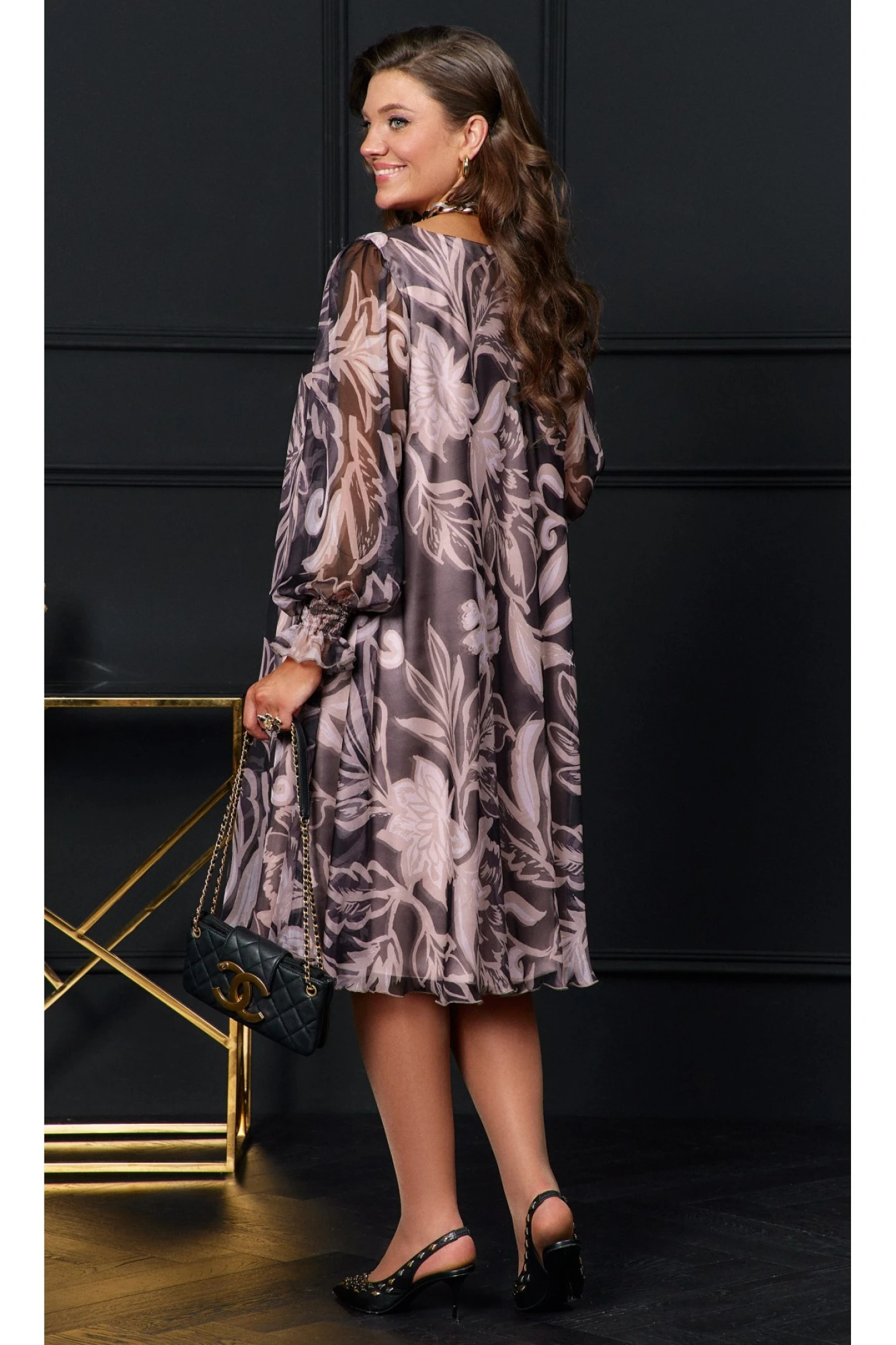 Длина платья от высшей точки плечевого шва до низа 108 см (р 50-54), 109 см (р 56-60). Длина рукава 66 см.