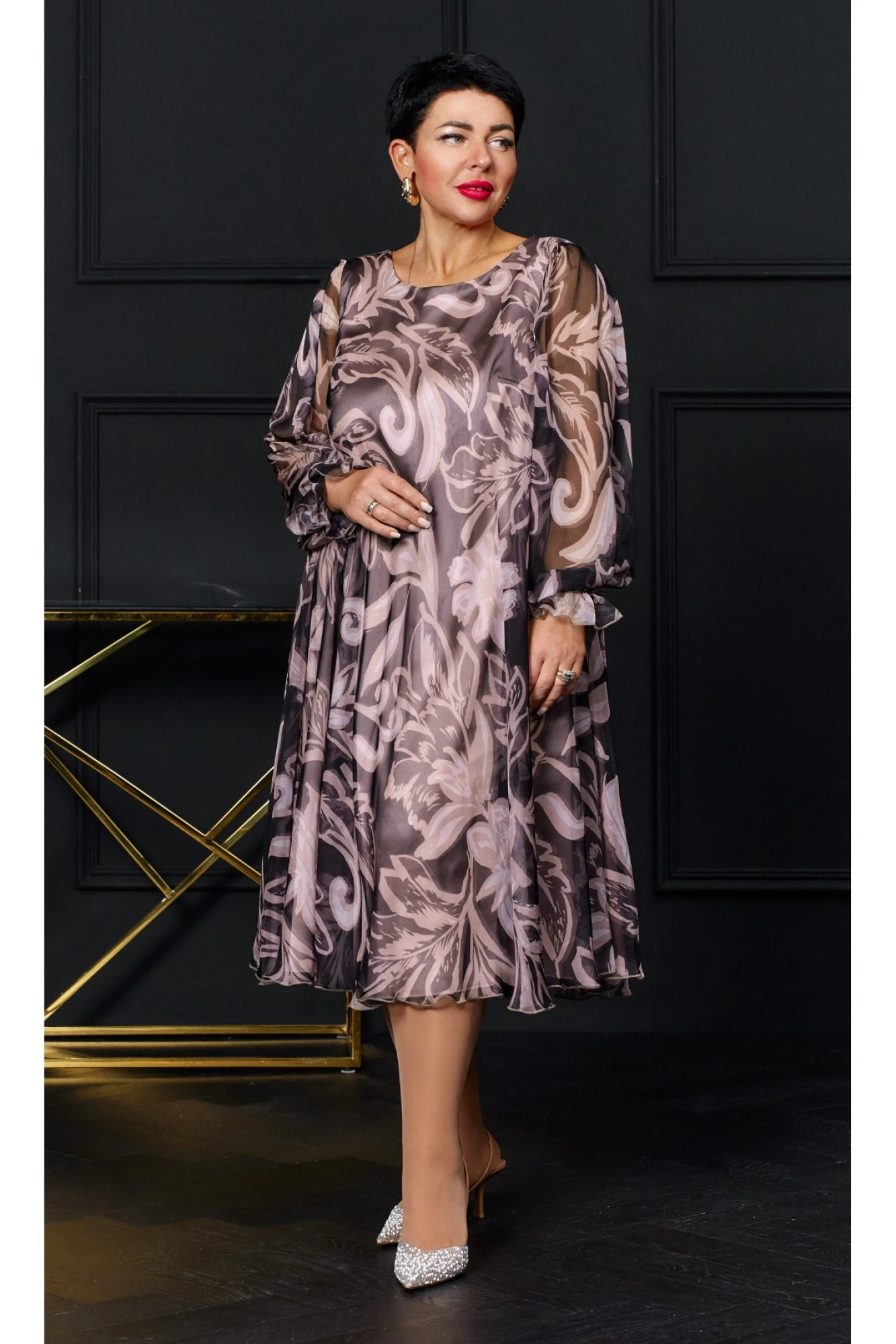 Платье трапециевидного силуэта с дизайнерским цветочным принтом, который создаёт игривое настроение за счёт лёгкости ткани и силуэта модели. Платье с округлой горловиной, нагрудными вытачками, перед и спинка платья на подкладке. Рукав втачной одношовный, длинный со сборкой на венгерку и рюшей.