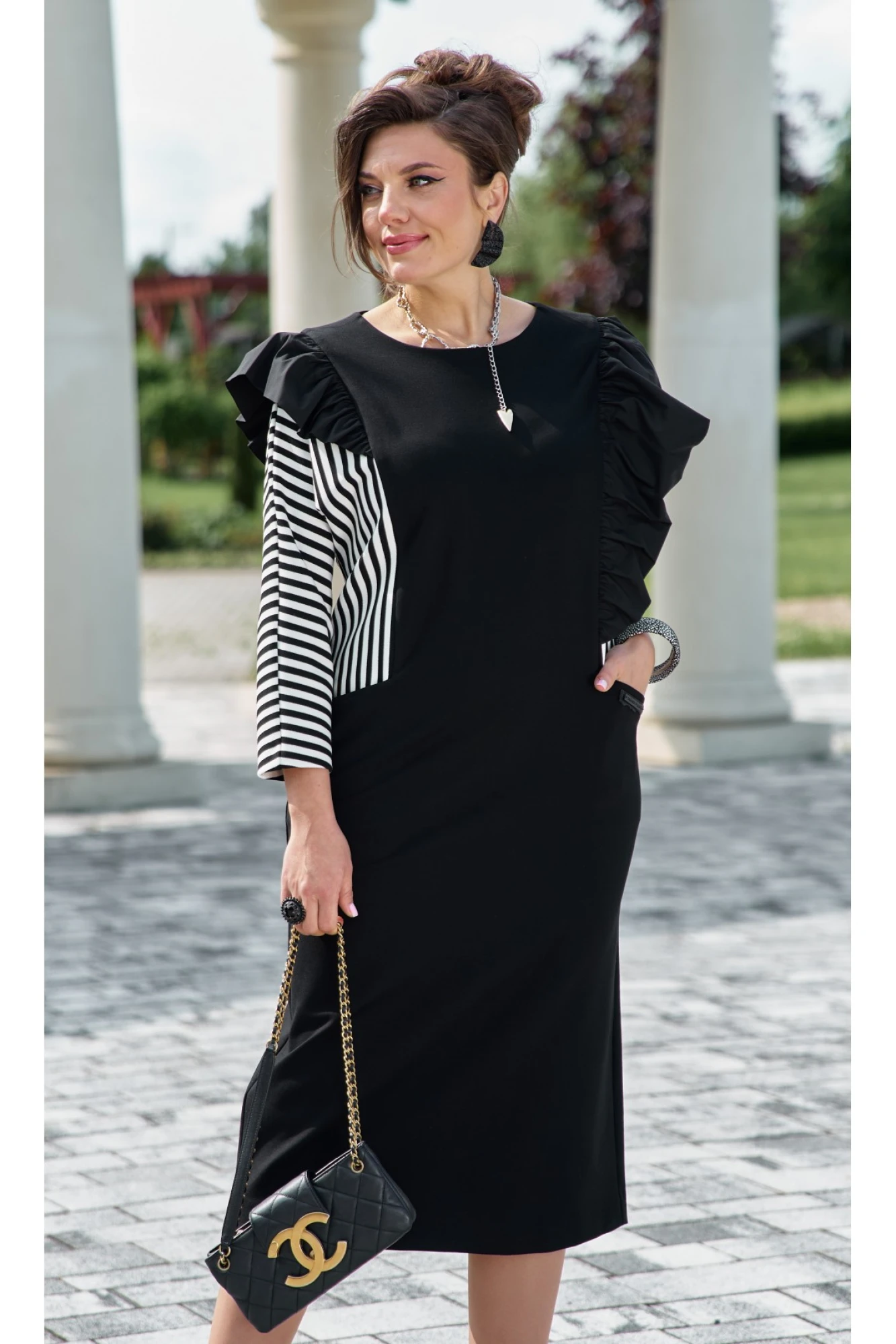 Платье женское из плотного чёрного трикотажа со вставками из отделочного материала — трикотажной полоски, визуально делает силуэта приталенным, а декоративные элементы в виде рюш по плечам добавляют образу игривости. Данная модель станет отличным вариантом для работы, прогулок, встреч в кафе. Платье свободного силуэта слегка заужается к низу, горловина с декоративным вырезом по форме «лодочка». По переду и спинке платья декоративные рельефы , переходящие в карман по переду. В качестве дополнительного декоративного элемента в рельефах платья — рюши из отделочной ткани, переходящие на спинку. По спинке платья вырез капелька с застёжкой на пуговицу, спинка в платье со средним швом заканчивающимся шлицей. По переду платья декоративный элемент в виде нашивки. Рукав цельнокроеный, длиной 7/8.