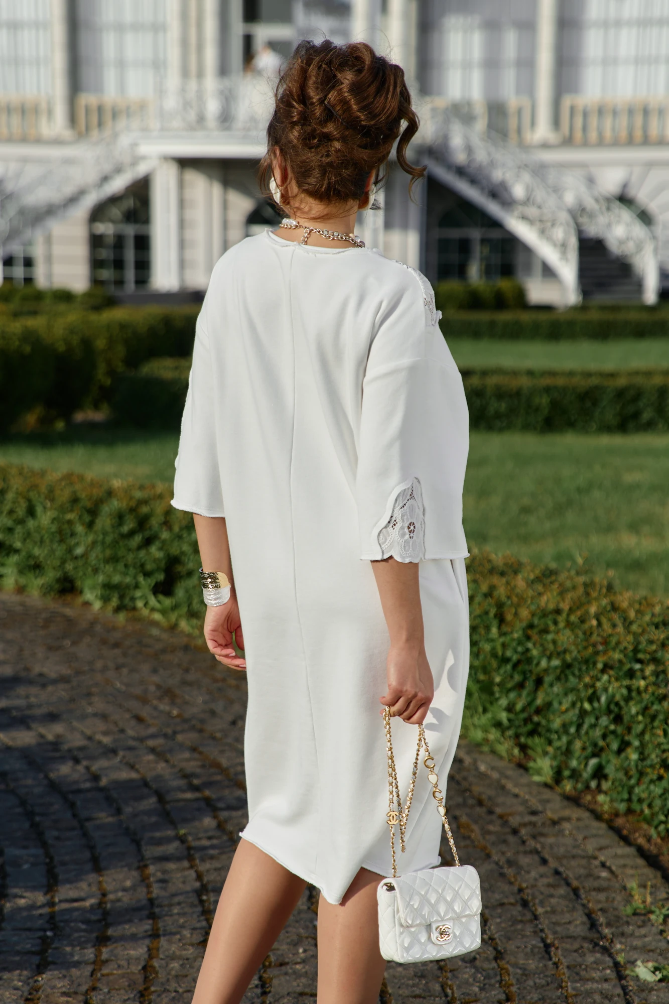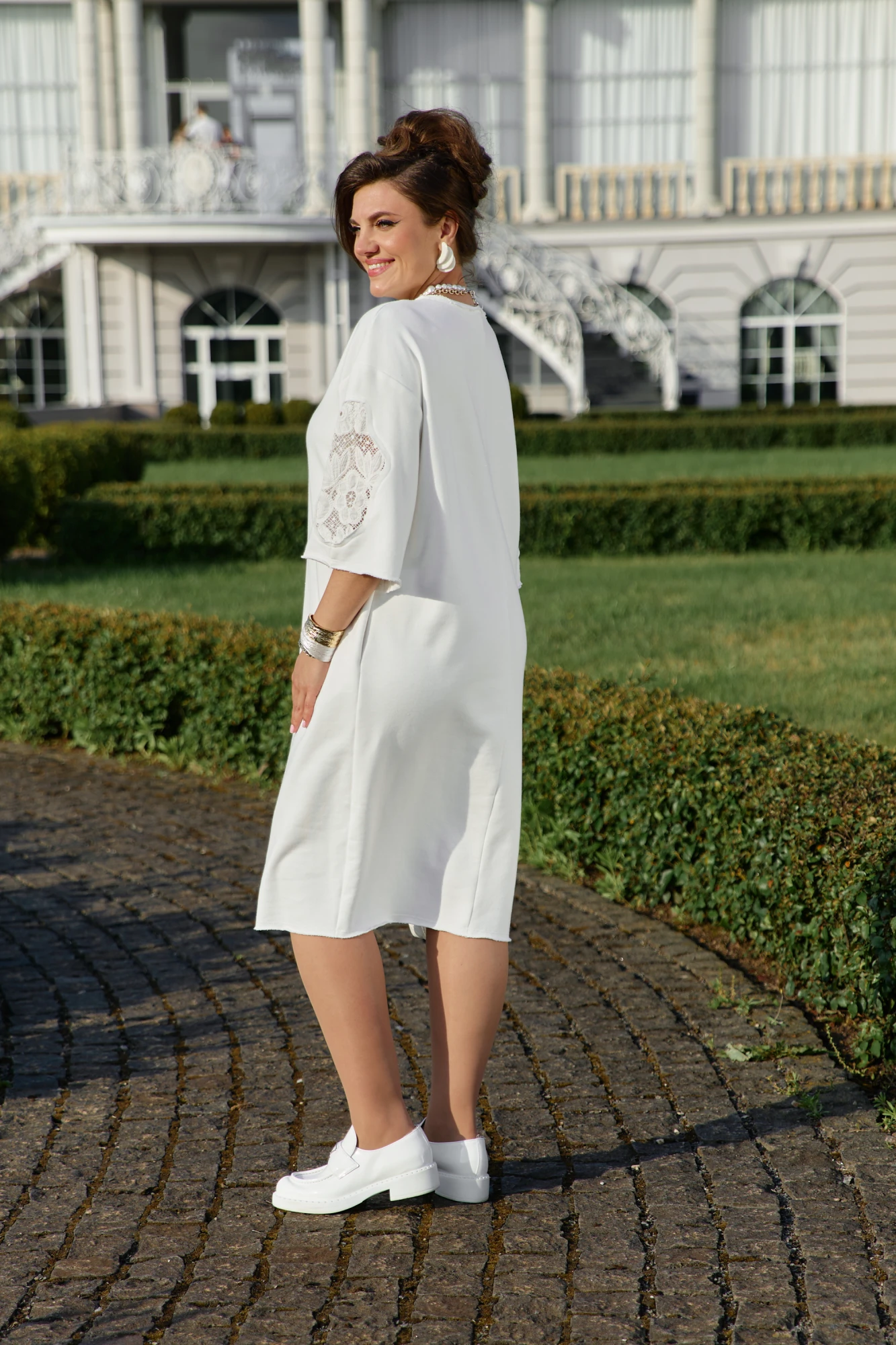 Если Вы ищете идеальное сочетание стиля и комфорта, вот идеальный выбор. Мы специально подобрали качественную и тактильно приятную ткань, которая хорошо держит свою форму, создавая ощущение легкости и свободы движения. Отделочные вставки из вышитого ришелье в тон добавляют образу романтичные нотки. Платье свободного силуэта с округлой формой горловины, линия плеча спущенная. По переду платья декоративная вставка из отделочного материала- вышивки ришелье. Спинка в платье с средним швом. Рукав втачной, длиной 7/8. В качестве дополнительного декоративного элемента в рукавах ассиметричные вставки из ришелье. Главной особенностью в изделии является эффект необработанных срезов, который добавляет образу дерзости. Длина платья по спине 107 см (р 50-54), 109 см (р 56-60), длина рукава 32 см.