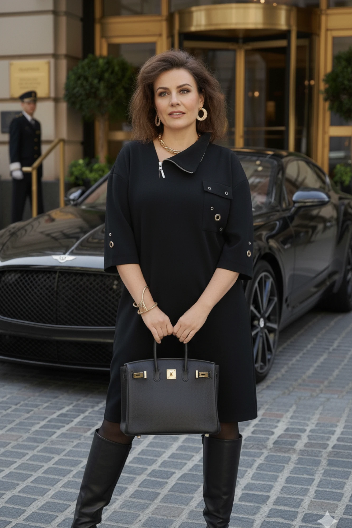 Платье свободного силуэта, горловина ассиметричной формы. По переду платья фигурная кокетка с функциональной молнией, нагрудный карман с клапаном и декоративной отделкой в виде металлической фурнитуры. Линия плеча спущенная, рукав втачной, длиной ¾, широкий к низу. Спинка в платье со средним швом заканчивающимся разрезом. В боковых швах платья карманы. Длина платья 106 см (р 50-54), 108 см (р 56-60). Длина рукава 30,5 см.