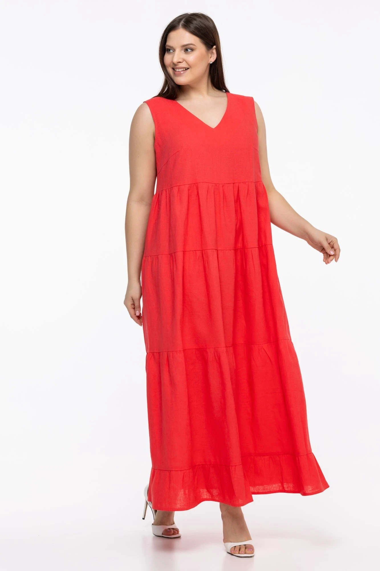 Платье-сарафан яркого цвета из льна - это стильное и удобное летнее платье без рукавов, свободного кроя. Оно имеет длинную юбку, которая создает легкий и воздушный образ. Наличие воланов добавляют ему женственности и изящности. Такое платье идеально подойдет для жаркого летнего дня, оно будет комфортным и стильным выбором для прогулок по городу или отдыха на природе.