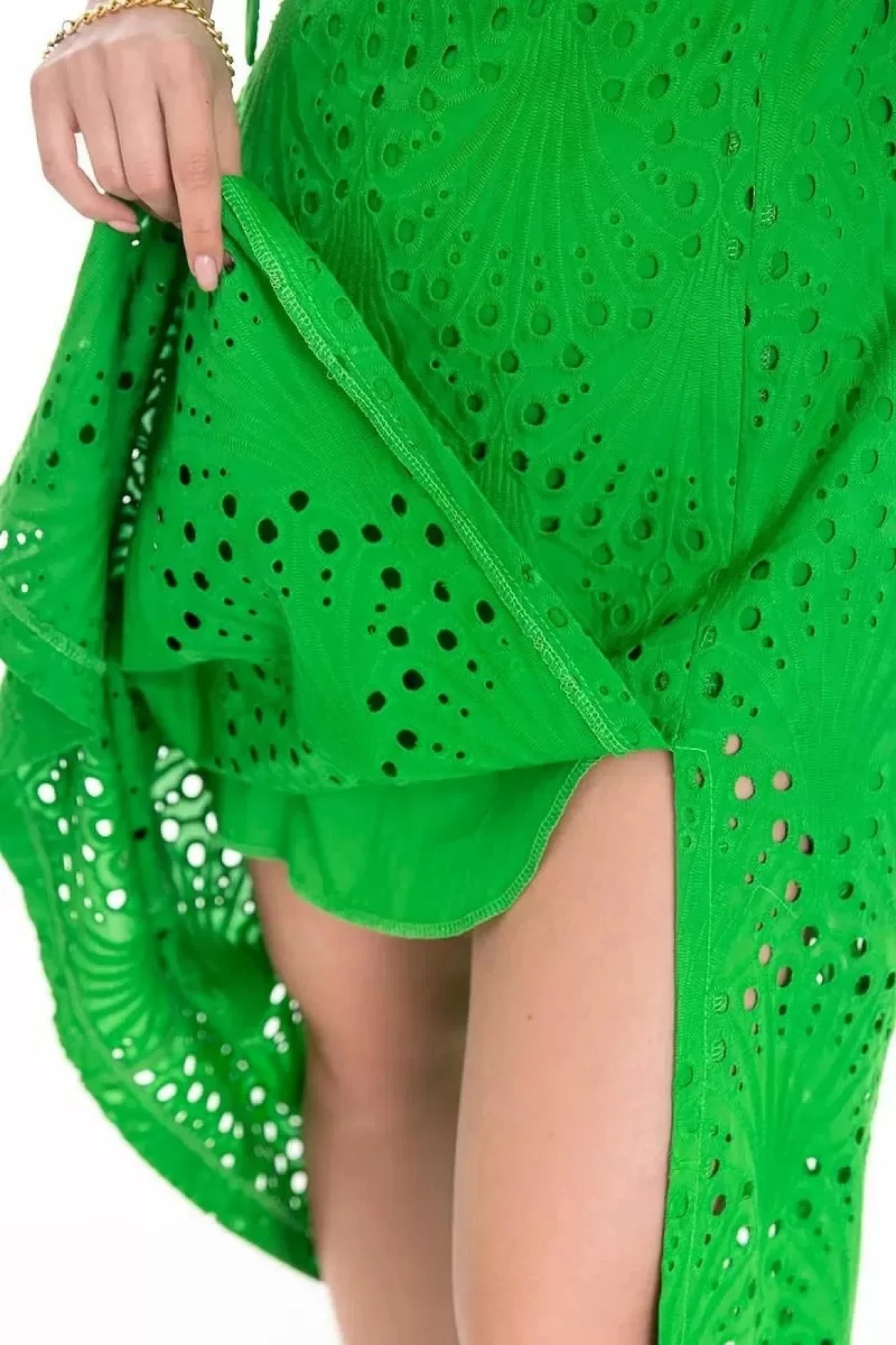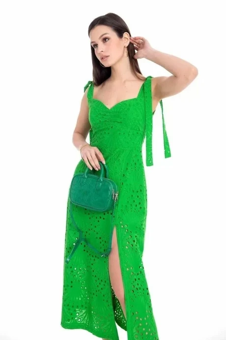 Сарафан-миди прилегающего силуэта из шитья. Отрезной по талии, с чашками и рельефами по переду и спинке. Бретели-завязки. По спинке - застежка - потайная молния. Юбка в изделии расклешенная, с разрезом по переду.