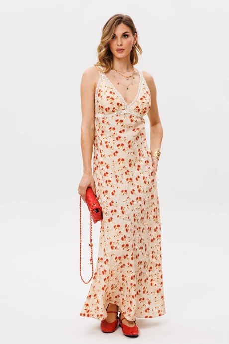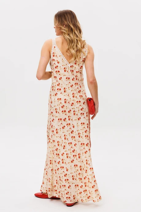 Сарафан выполнен из плательно-блузочной ткани с цветочным принтом. Сарафан полуприлегающего силуэта, длиной до линии щиколотки. Перед и спинка покроены по косой. Спереди фигурные подрезы под грудью. Горловина V-образной формы. Сарафан декорирован тесьмой-кружевом, переходящим в бретели. Лиф двойной.