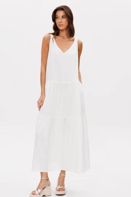 "Лето-пора эффектных и максимально открытых платьев, а белый летний сарафан изо льна-символ легкости и безупречности, комбинация экологичности и модного акцента. Максимальная длина, А-силуэт, горизонтальные воланы с частичной сборкой, карманы в боковых швах, V-образный вырез на лифе. Верхняя часть полочки с нагрудной вытачкой. По верхнему срезу спинки-эластичная вставка. Модель отличает необычное расположение разноширинных шлеек, оригинально перекрывающихся на спинке.