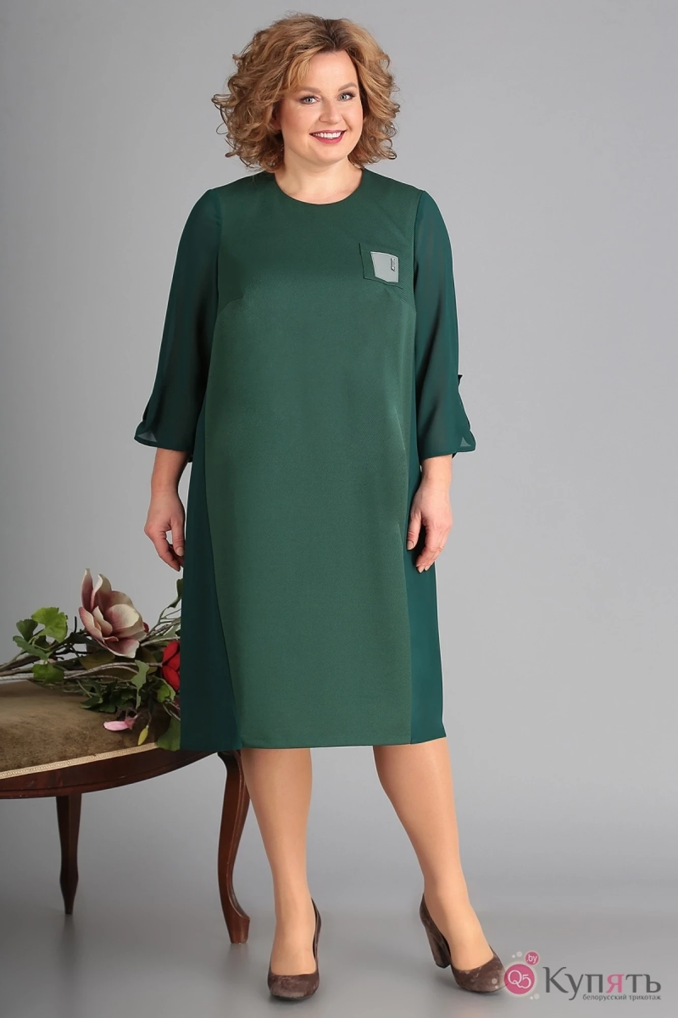 Нарядное женское платье прямого силуэта выполнено на контрасте двух тканей. Спинка со встречными складками и переходящим боковым швом на перёд. На переде платья есть нагрудные выточки и в верхней левой части небольшой карман. Вырез горловины круглый. Рукава одно шовные, длиной 3/4, прямые, имеется пата на петлю и пуговицу. Модное, лаконичное платье станет неотъемлемой частью вашего гардероба.