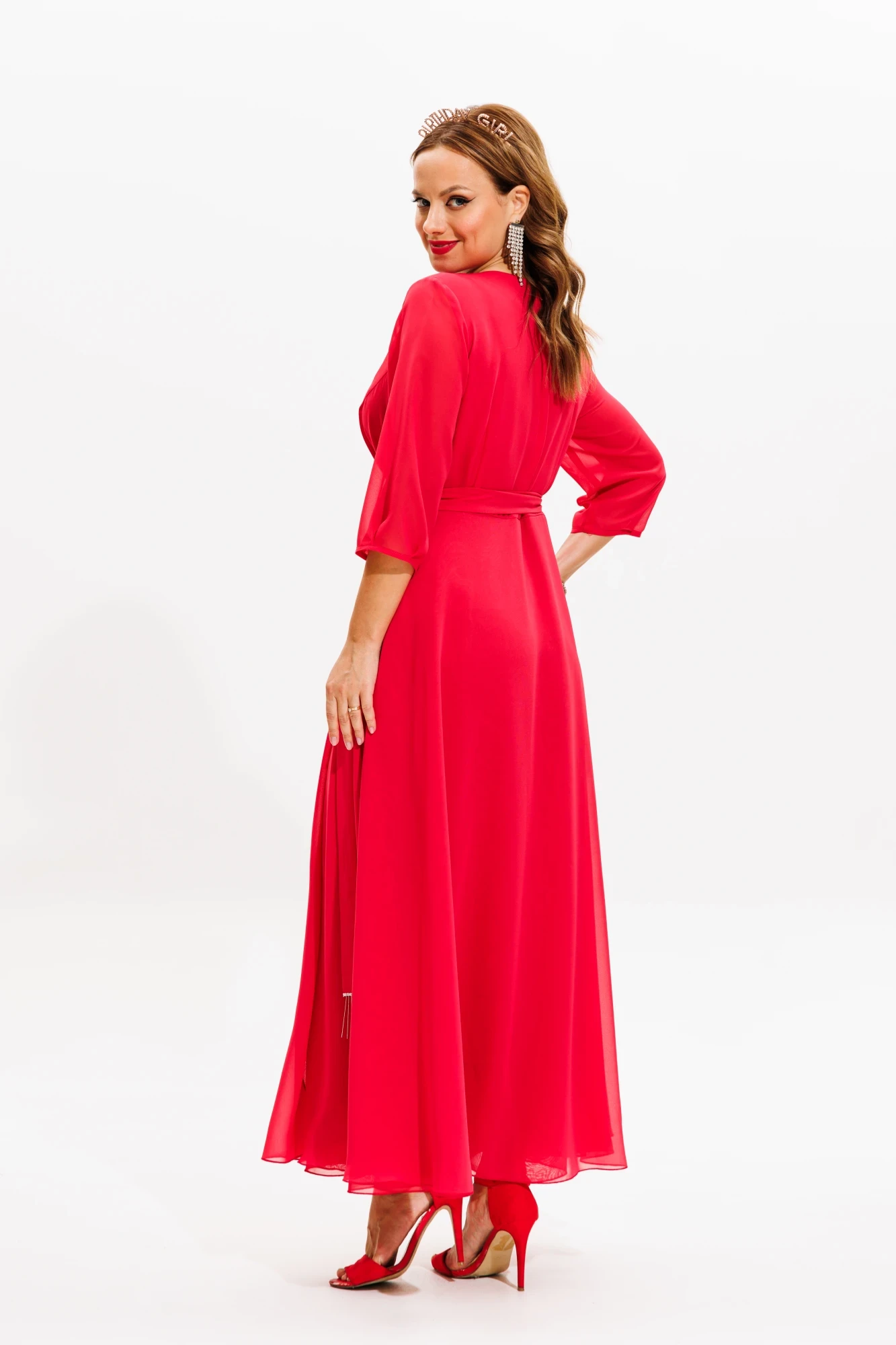 Элегантное женское платье из блузочной ткани отрезное по линии талии. Благодаря своему крою прекрасно будет смотреться на любой фигуре, скрывая недостатки. Спинка и полочка -двойные. Юбка-солнце-клеш (двойная). На лифе переда-нагрудные вытачки с проймы и по 2-е мягкие складки по талии. Спинка со средним швом и выточками. В правом боковом шве лифа - отверствие для пояса,который протягивается и завязывается по переду. Рукав втачной,одношовный, длиной 3/4. По низу рукава - мягкие складки. В качестве декора - металлизированная бахрома по горловине полочки и по краю пояса.