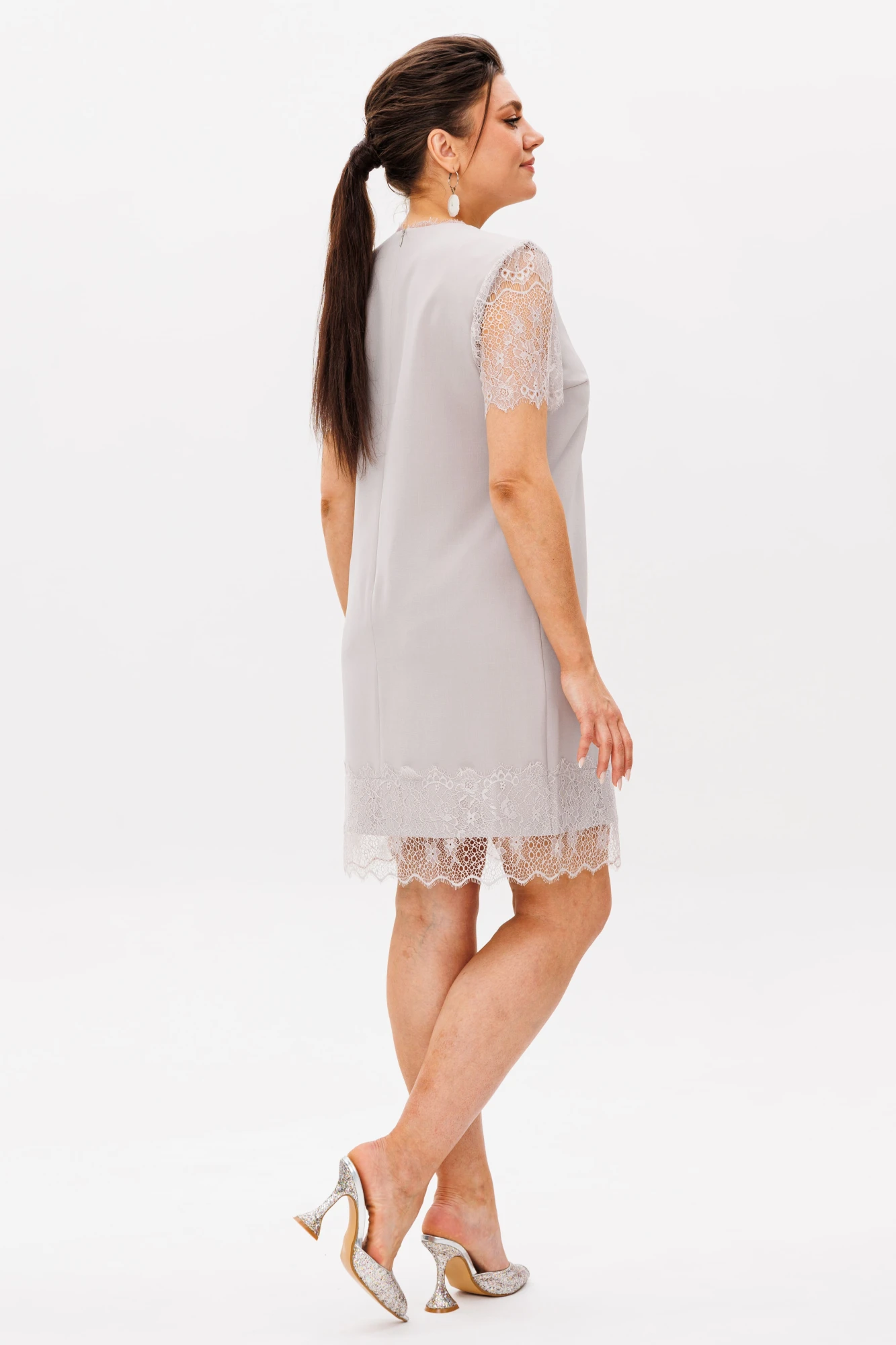 Изящное короткое платье, украшенное изысканным французским кружевом, станет жемчужиной вашего гардероба. Нежное кружево обрамляет V-образный вырез горловины, рукава и подол, добавляя образу воздушности и романтичности.