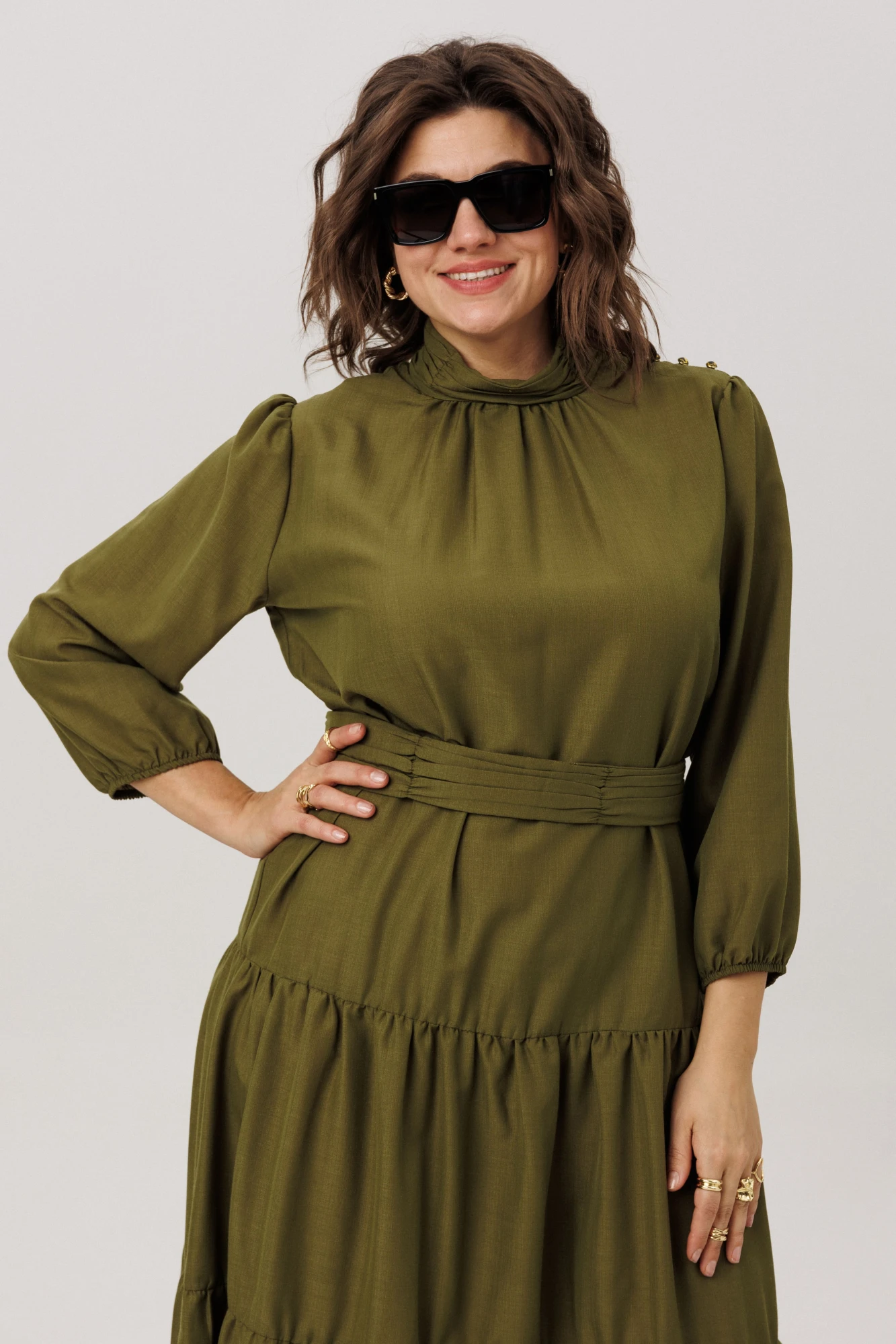 Свободный силуэт этого платья в цвете «испанская оливка» словно создан для городского ритма, придавая ярким будням лёгкость и особый шарм.