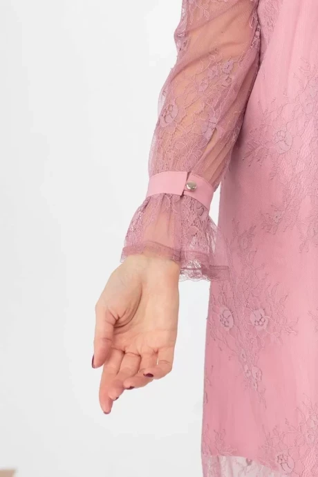 Втачной рукав на манжете и воланом по низу с застежкой на красивую пуговку. Воротник стойка, обработанный кружевной тесьмой. Застежка на пуговицы по стойке сзади.
