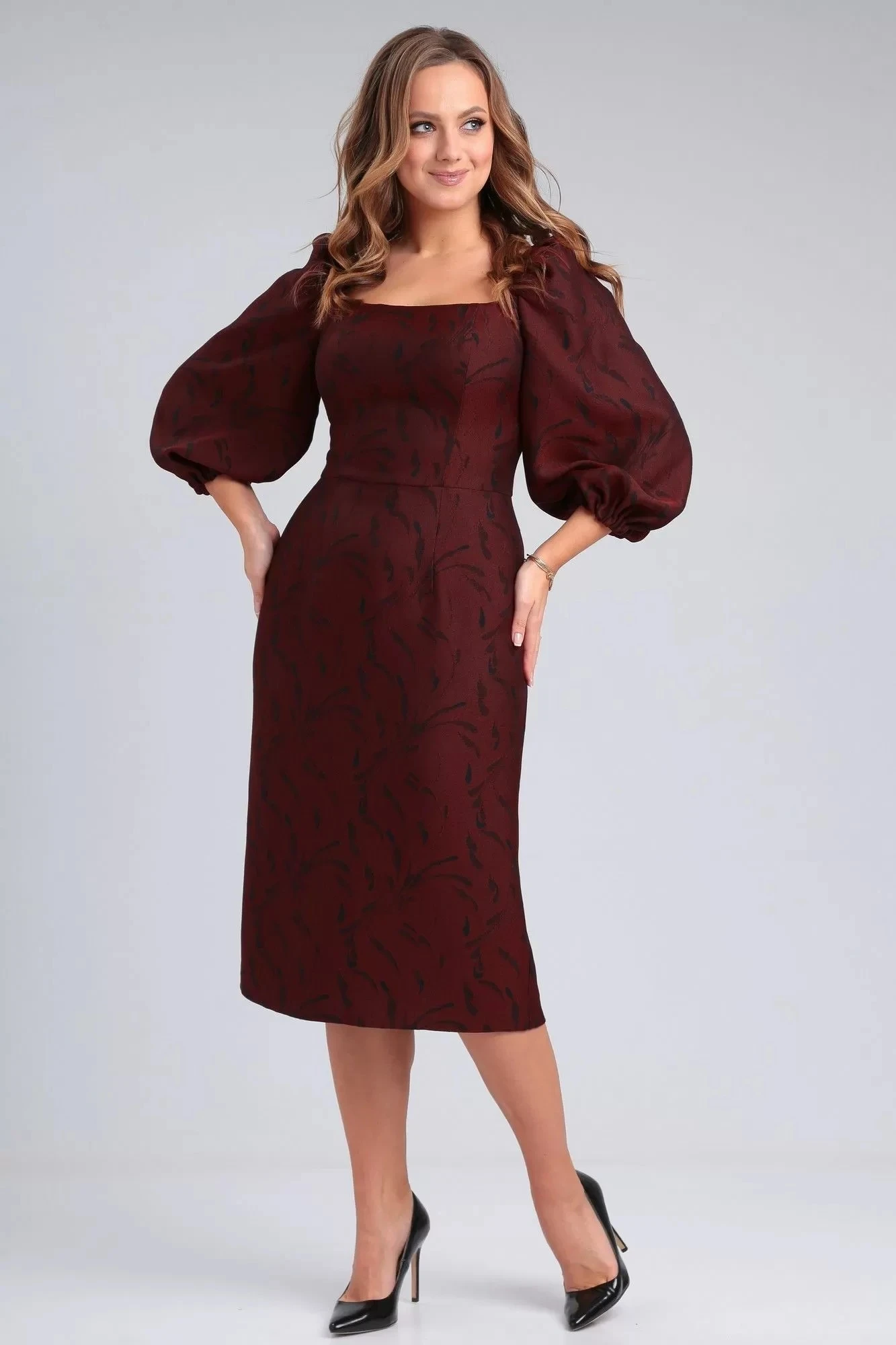 Платье из костюмно-плательной ткани приталенного силуэта длиной чуть ниже колена. Вырез горловины квадратной формы - каре. Отрезное по линии талии. Перед и спинка с рельефами. По спинке средний шов, в котором вставлена потайная молния, внизу разрез. Рукав втачной длиной 3/4, по окату собран на резинку, в нижней части рукава сборка на резинку."