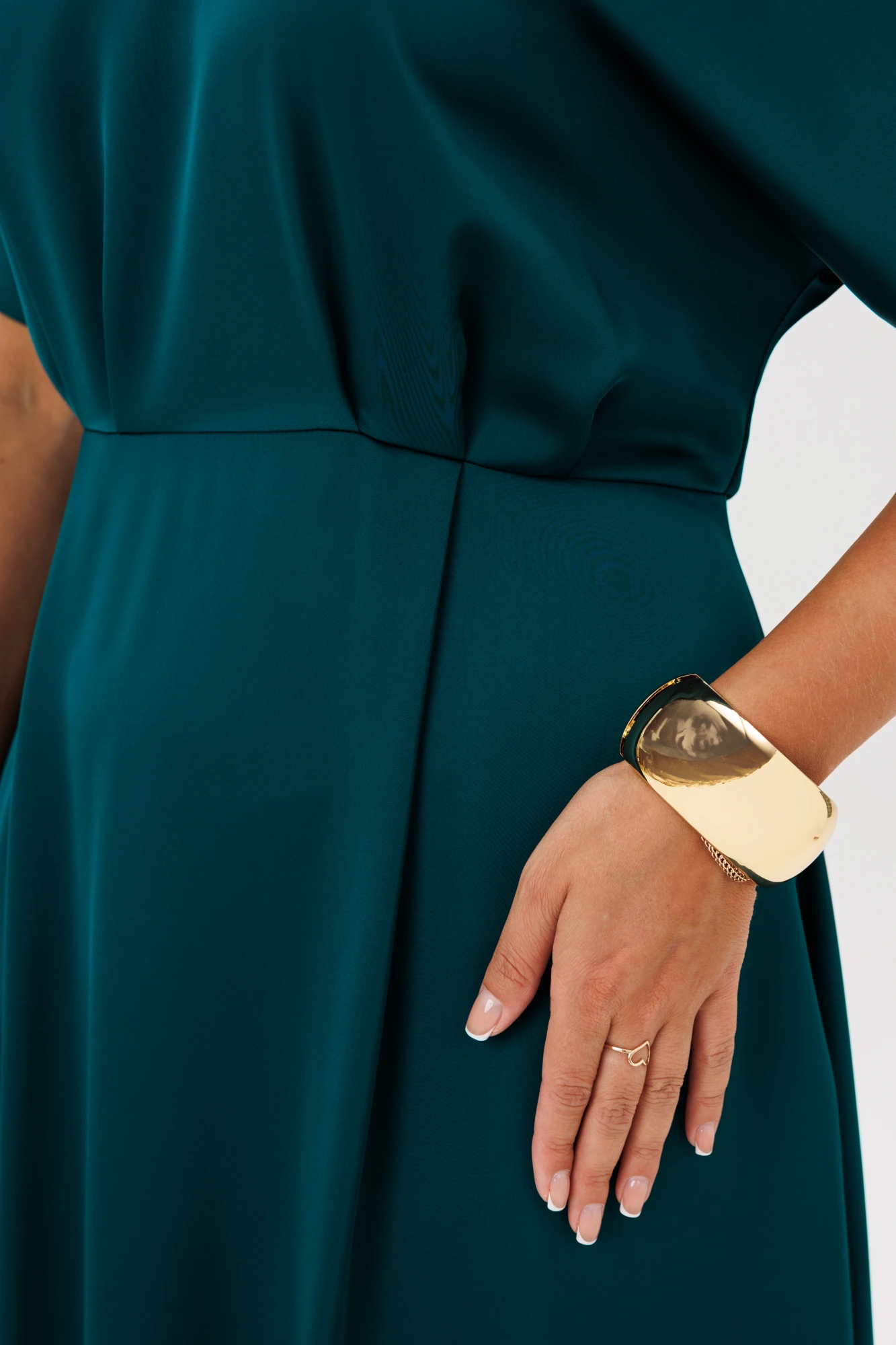 Платье умеренного объема, прилегающего силуэта по лифу, отрезное по линии талии, со складками по лифу и юбке. У платья V-образный вырез горловины. Застежка на молнию в среднем шве спинки. Юбка А-силуэт. Универсальная модель, подойдет на разные случаи жизни. Матовый атлас, за которым легко ухаживать, не электризуется.