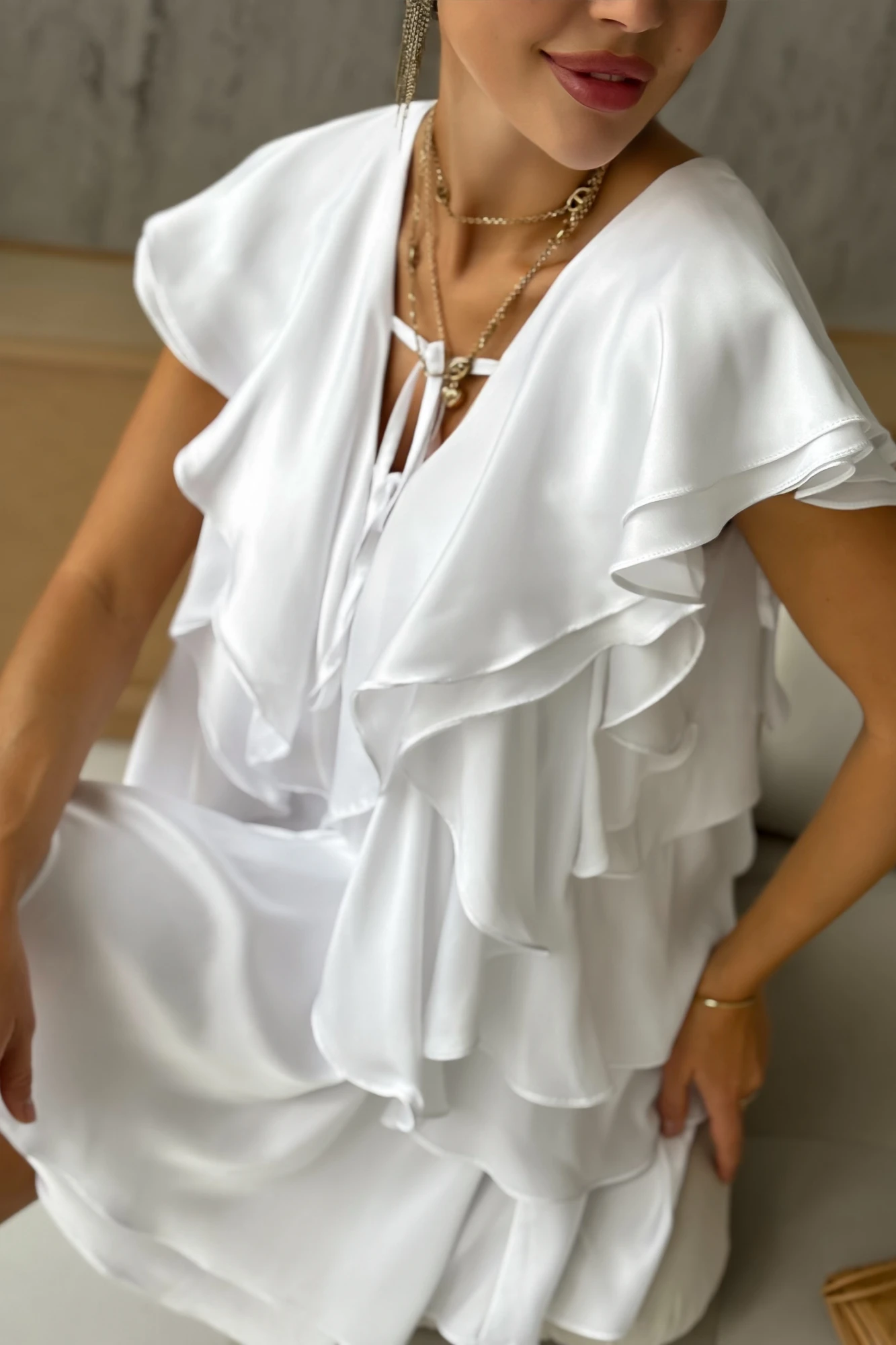 Это платье – легкий десерт на центральной площади Рима . Платье в длине мини с крупной драпировкой, изготовлено из атласной ткани с деликатным блеском. Тонкие шнуровки для помогут при желании больше прикрыть спинку и лиф. Главный акцент платья — объёмные драпировки в виде воланов на юбке и лифе, которые подчеркивают воздушность силуэта.