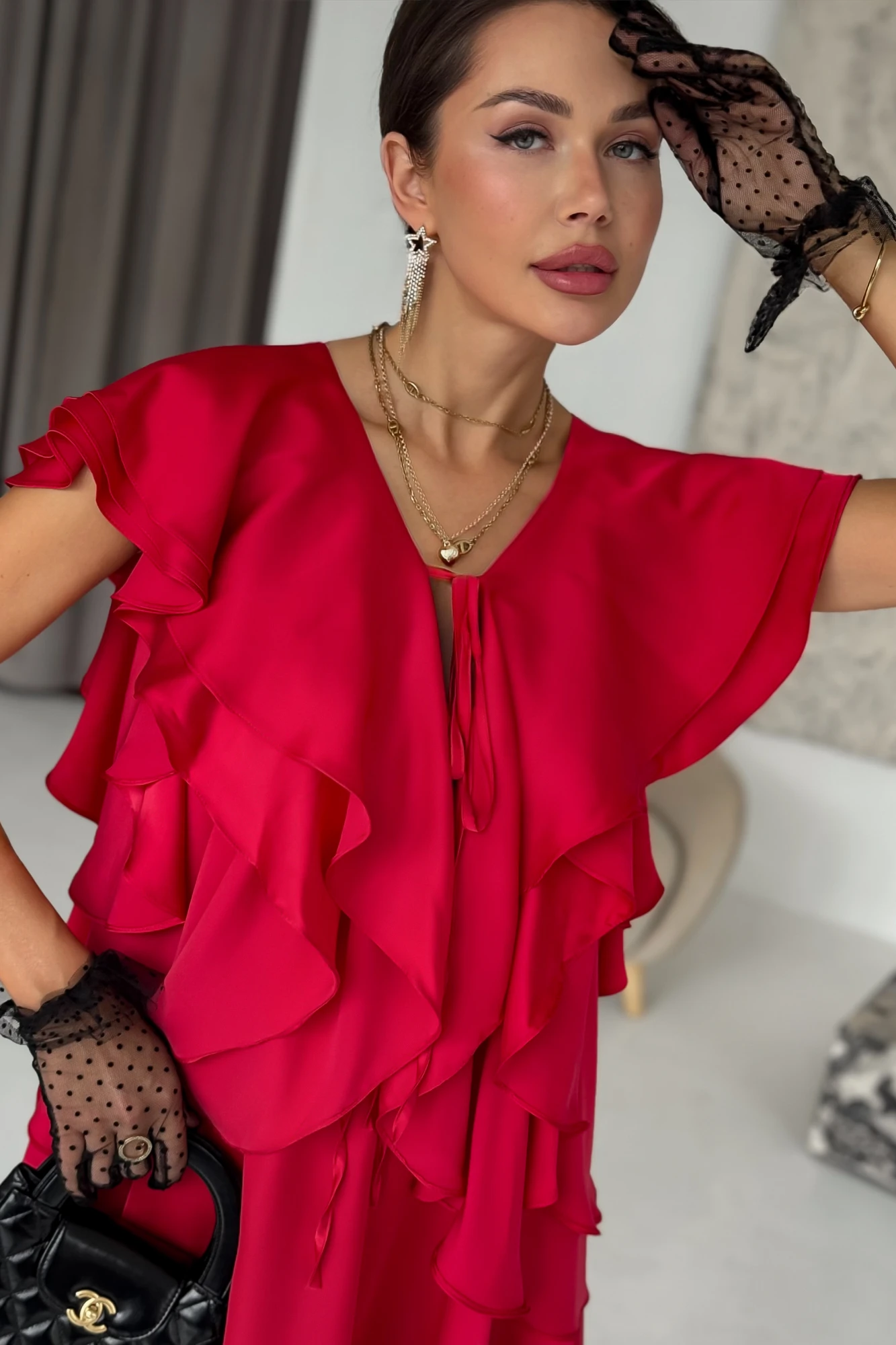 Это платье – легкий десерт на центральной площади Рима . Платье в длине мини с крупной драпировкой, изготовлено из атласной ткани с деликатным блеском. Тонкие шнуровки для помогут при желании больше прикрыть спинку и лиф. Главный акцент платья — объёмные драпировки в виде воланов на юбке и лифе, которые подчеркивают воздушность силуэта.