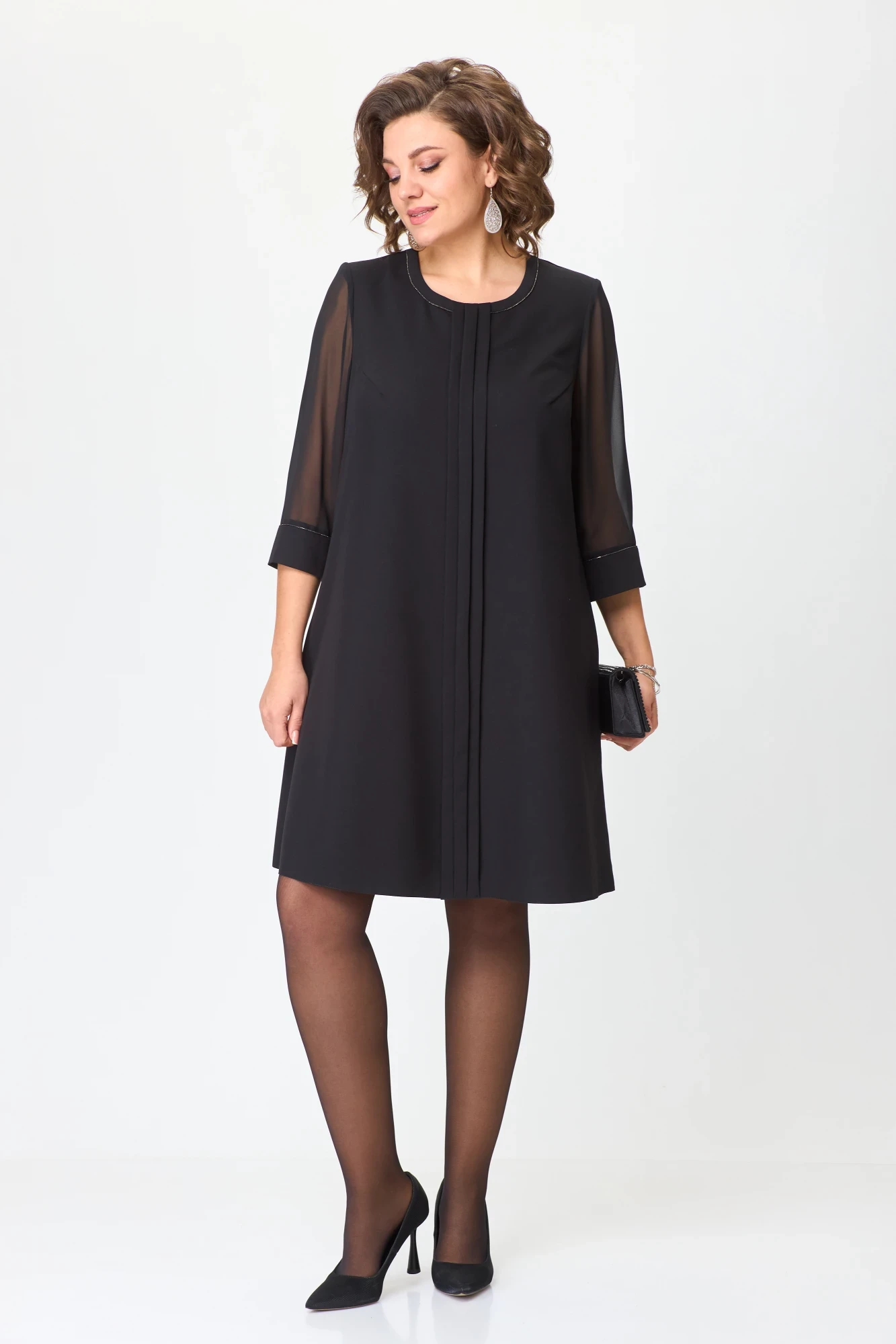 Платье женское А-силуэта, выполнено из плательной ткани в сочетании с шифоном. Горловина платья округлой формы, с планкой, которая декорирована отделочной тесьмой. По центру полочки выполнены складки, которые зрительно вытягивают силуэт. Есть нагрудные выточки, выходящие из проймы. Рукав втачной, одношовный из шифона. Низ рукава на притачной манжете с декоративной тесьмой. Спинка платья разрезная с «капелькой» и застежкой на навесную петлю и пуговицу. Платья прекрасно подходит для корпоративов, новогодних праздников и других торжеств. Платье скроет недостатки и придаст нарядный и элегантный вид.