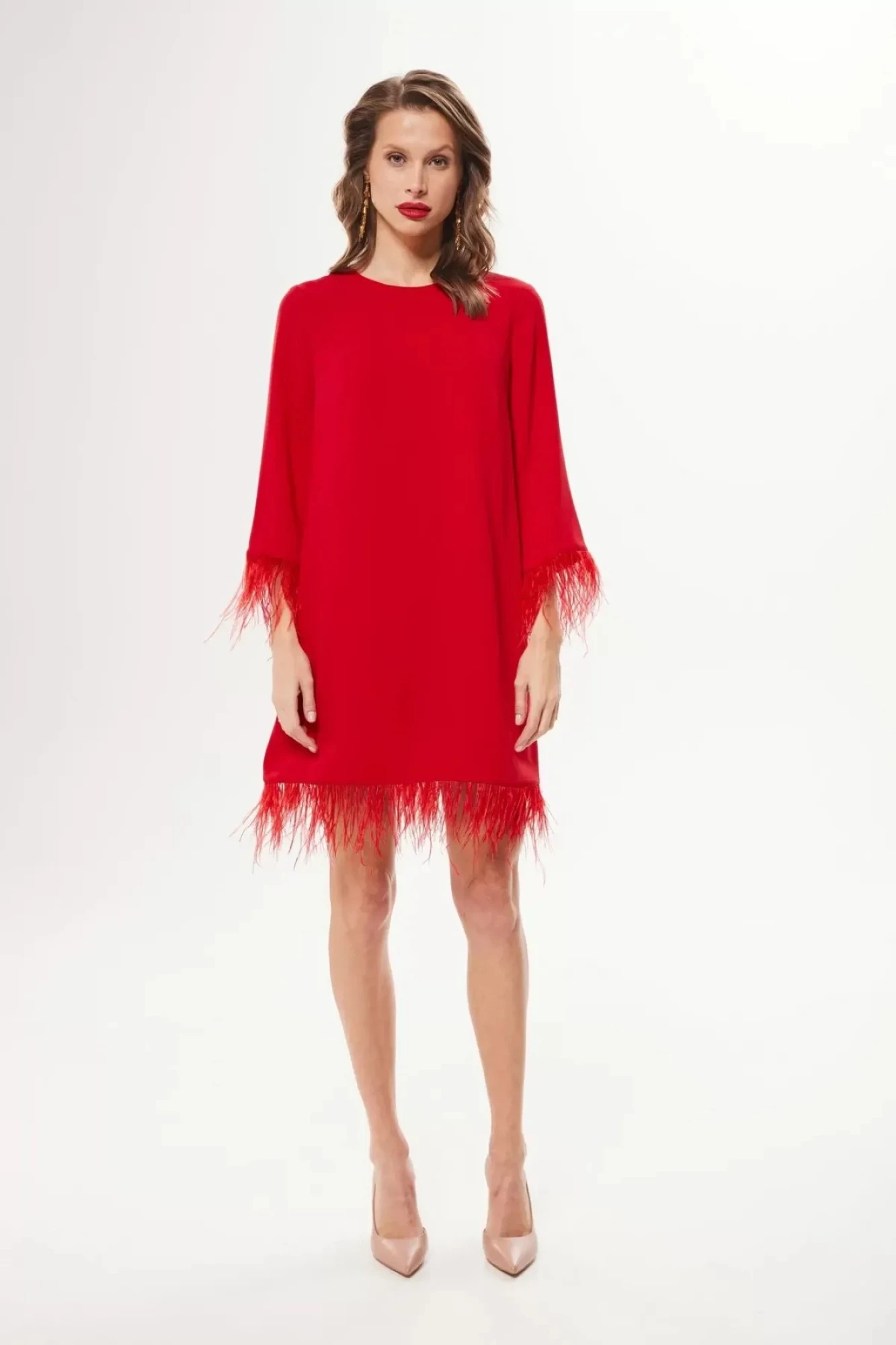 Платье женское, А-образного силуэта, выполнено из плательной ткани . Платье на подкладке .Низ платья и низ рукава обработан декоративной тесьмой из страусиных перьев . Рукав втачной одношовный к низу слегка расширен . Данная модель платья - идеальное дополнение к гардеробу современной девушки .