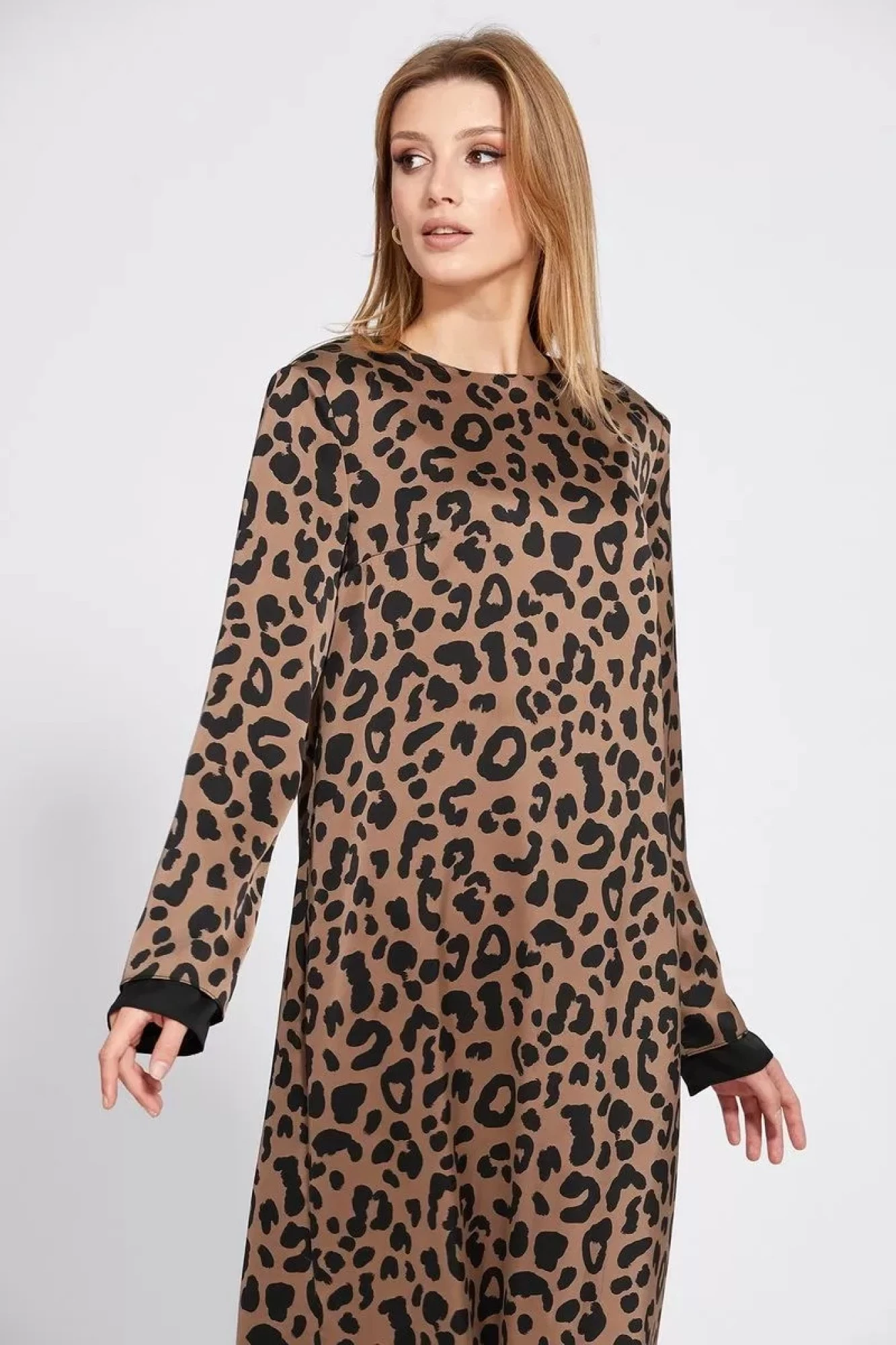 Платье выполнено из атласа с анималистичным принтом. Платье прямого силуэта длиной миди. Перед цельный. Спинка со средним швом в котором обработан разрез и застежка на потайную молнию. Горловина округлой формы. Рукав втачного покроя, одношовный. Платье на отлетной по низу подкладке. Низ платья и низ рукава декорированы нижним отлетным слоем из однотонной ткани. Платье с плечевыми накладками.