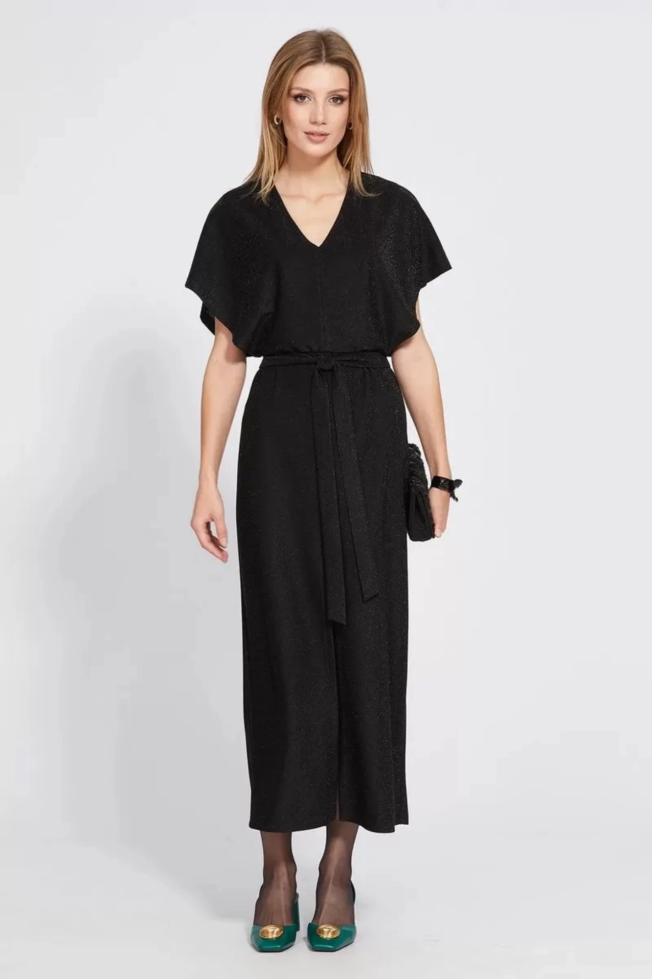 Платье приталенного силуэта, длиной миди , отрезное по линии талии, из трикотажного полотна с люрексом. Перед лифа двойной, покроя "летучая мышь". Юбка заужена к низу. Впереди разрез. Сзади центральная часть кокетки собрана на "венгерку". В боковых швах вставлен пояс.