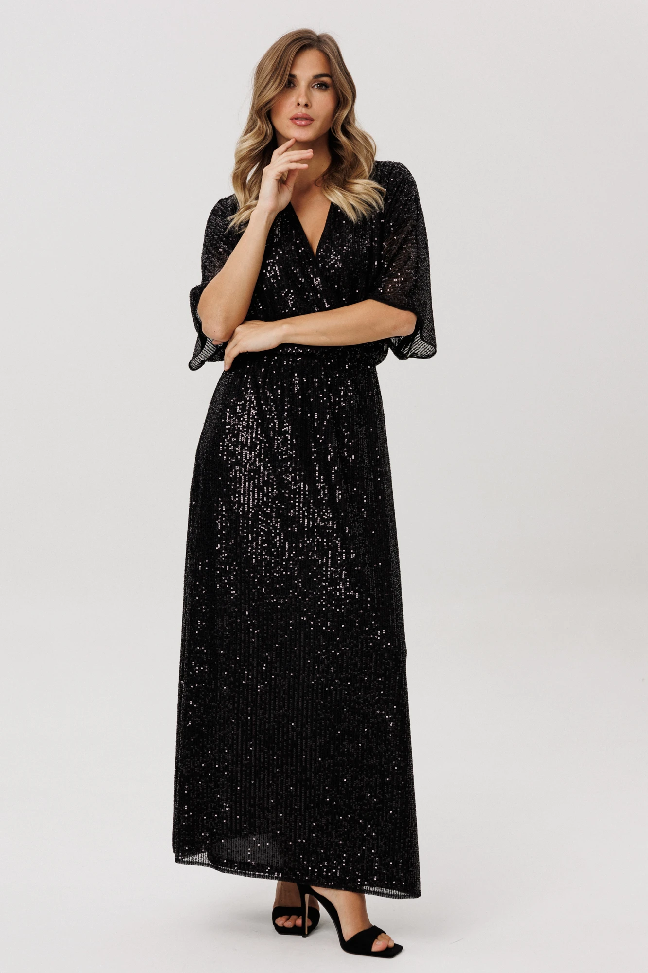 Платье выполнено из трикотажного полотна в пайетки. Платье X-образного силуэта, длиной миди, отрезное по линии талии. Лиф покроя кимоно. Перед выполнен на запах. Горловина V-образной формы. Переднее и заднее полотнище цельные и расширенные к низу. По линии талии эластичная тесьма. Платье на отлетной по низу трикотажной подкладке.