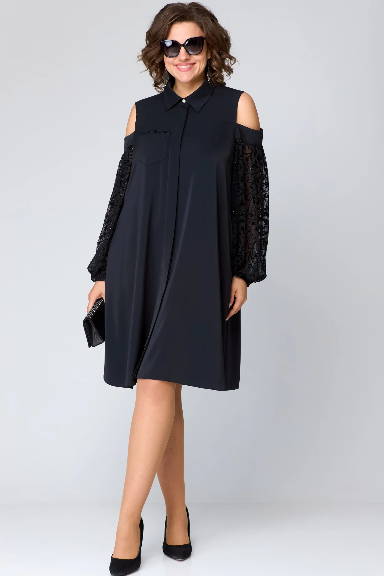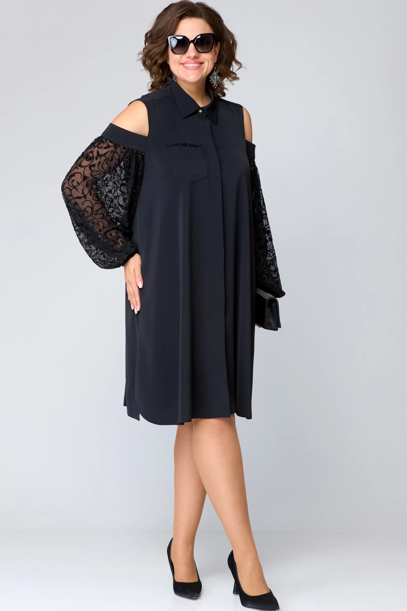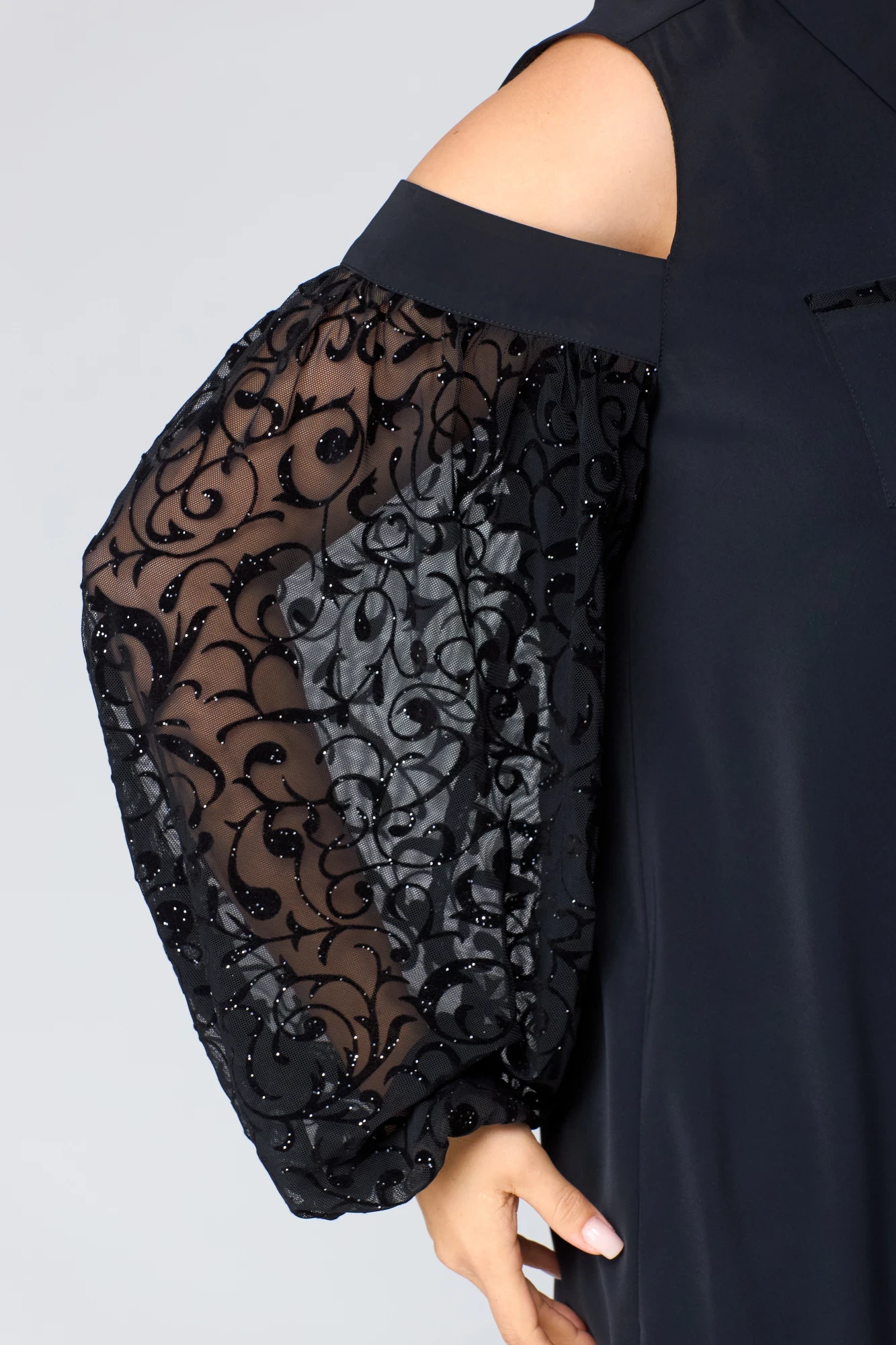 Платье женское нарядное А-образного силуэта выполнена из плательной ткани в сочетании с декоративной сеткой с набивным кружевом. Вырез горловины воротник на стойке рубашечного типа. Застежка потайная доверху на обметанные петли и пуговицы. Рукав втачной из декоративной сетки с набивным рисунком с открытым плечом со сборкой по верху и по низу. Низ рукава собран на резинку. В боковых швах обработаны разрезы. По правой полочке накладной карман. Декором служит принт на ткани рукавов и отделка по карману.