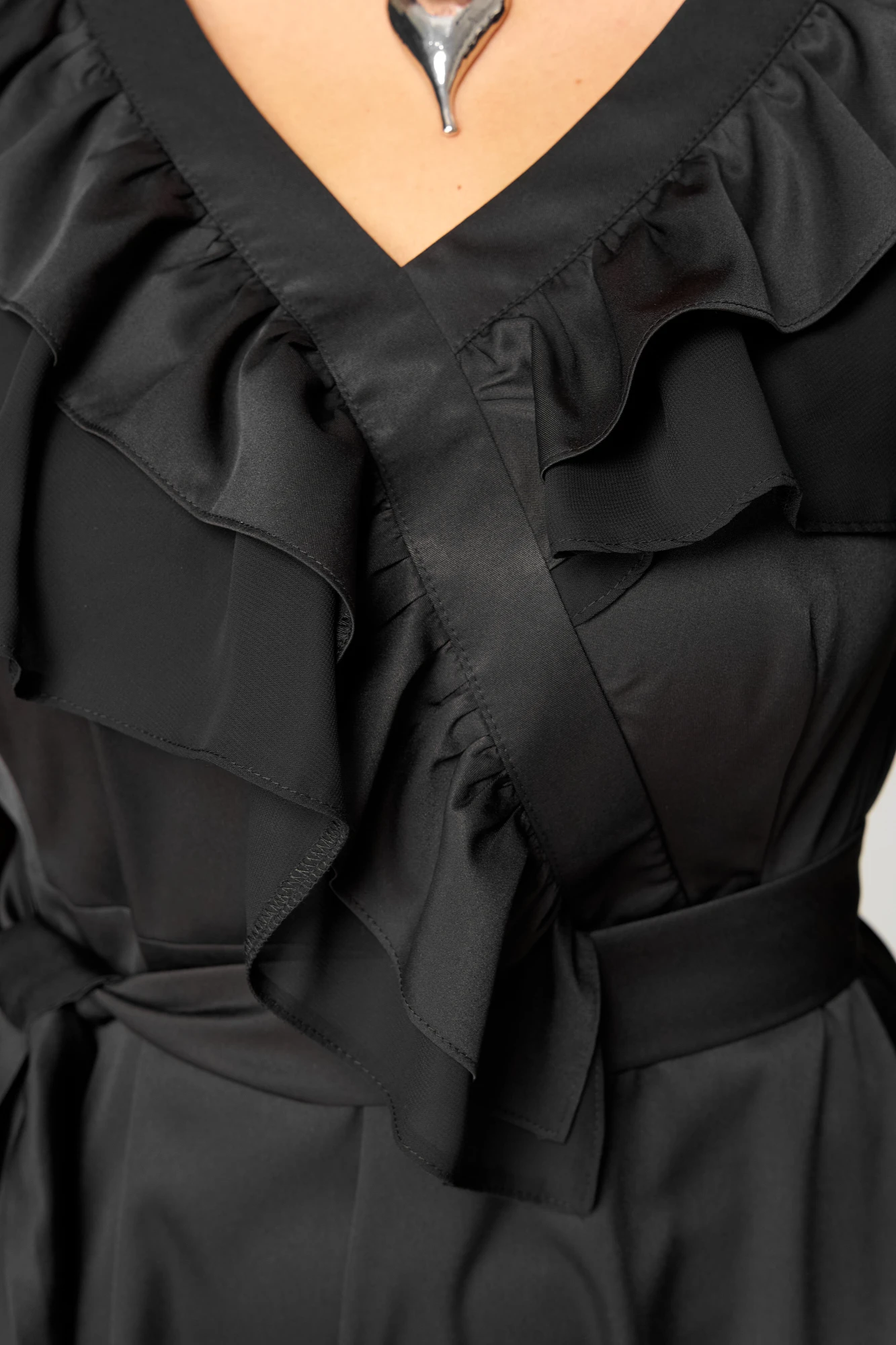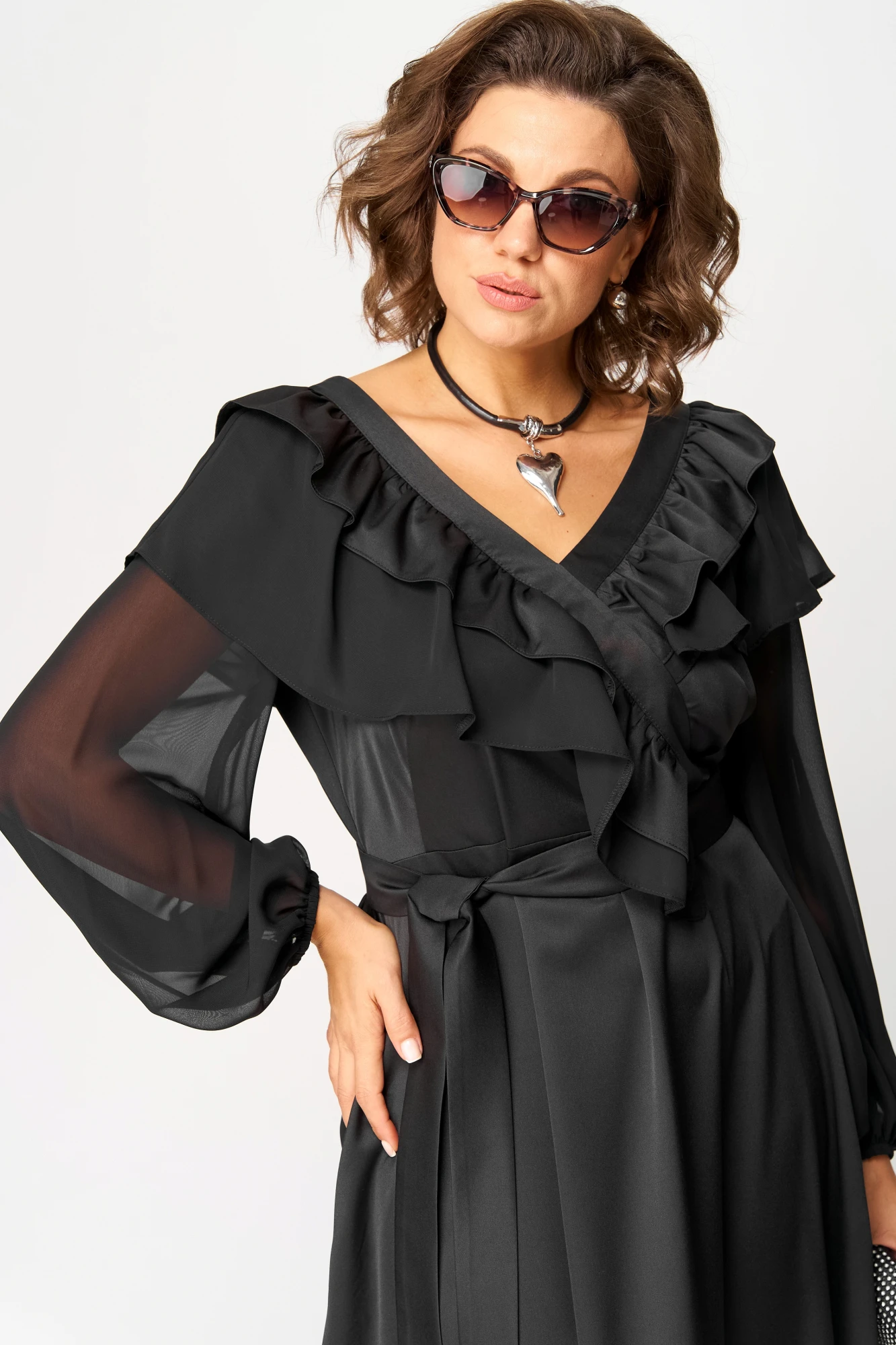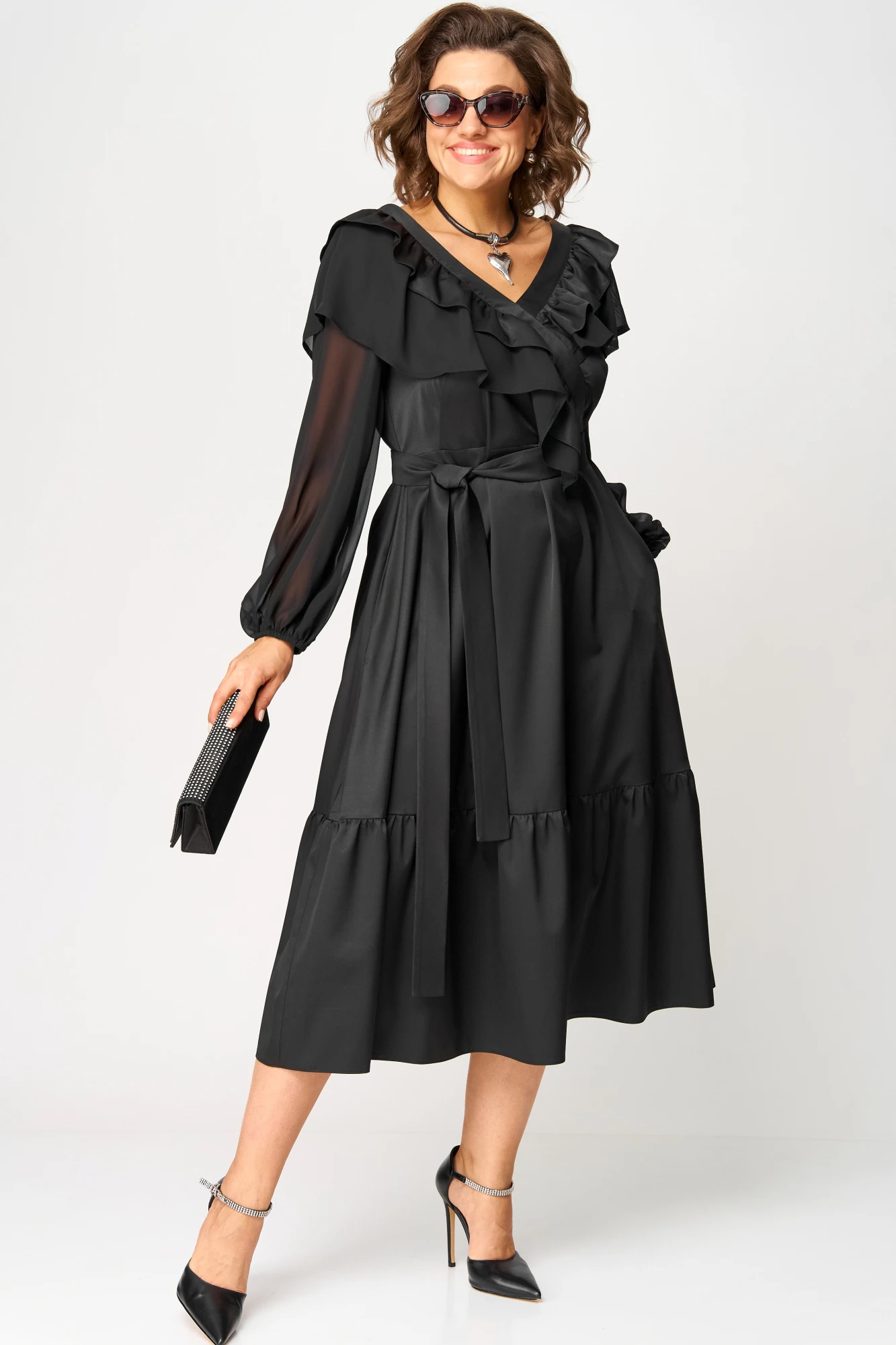 Платье женское нарядно-повседневное полуприлегающего силуэта до талии и расширенное к низу. Платье отрезное по линии талии, вырез горловины V-образный с ассиметричными рюшами из тканей двух дизайнов. Рукав втачной из шифона по низу на резинке. В боковых швах платья обработаны карманы, по низу притавчной волан из основной ткани. Декором платья служит съемный пояс из основной ткани.