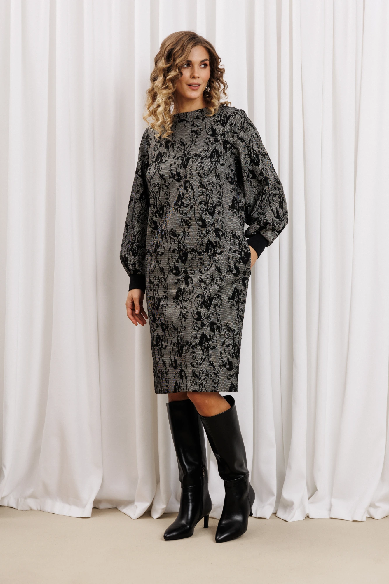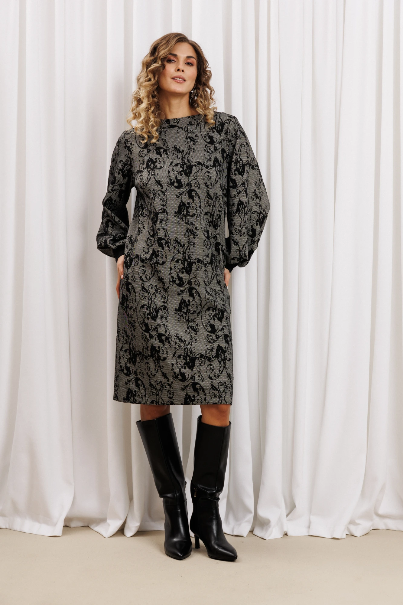 Платье прямого силуэта из плотного трикотажного полотна. Перед с нагрудными вытачками. Спинка со средним швом. Горловина лодочкой обработана планкой. Рукав одношовный втачной по низу со складками собранными на манжету-довяз. Длина платья-100см, длина рукава-60см.