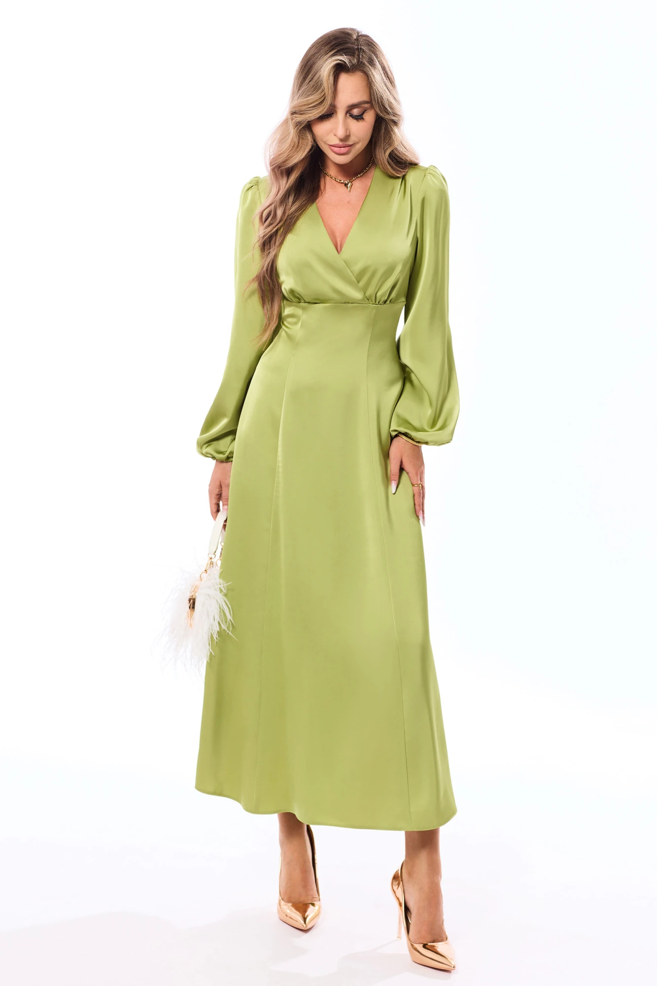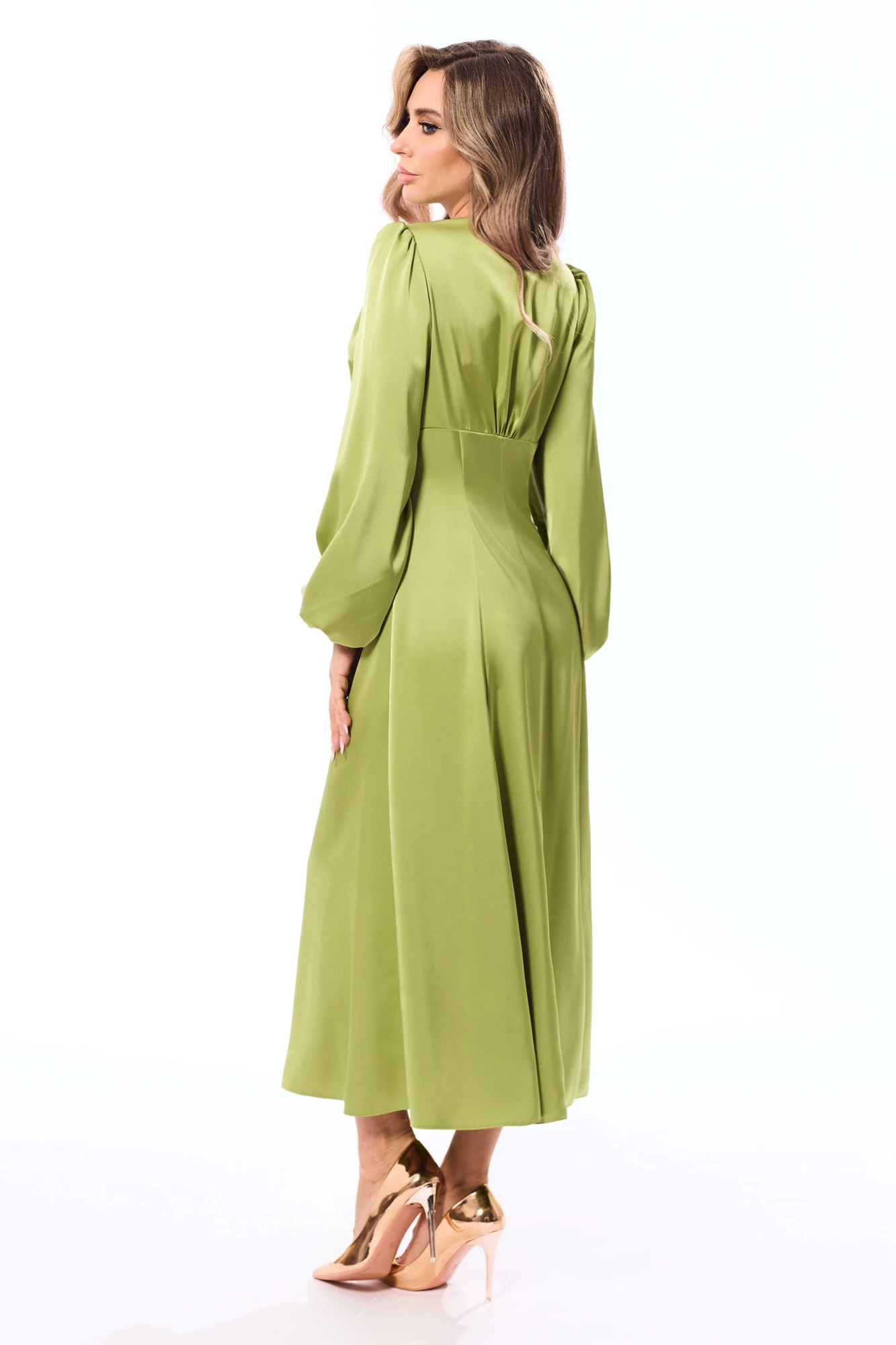 Платье, без воротника, с V-образным вырезом горловины, застежкой на потайную молнию в левом боковом шве. Платье отрезное по линии талии. Лиф переда с деталями на запах, со сборкой по плечевым и нижнему швам. Лиф спинки с частичной сборкой по низу. Рукав длинный, втачной, с отрезной манжетой, присборенной на резинку. Окат рукава со сборкой. Нижняя часть платья с двумя рельефными швами. Нижняя часть спинки со средним швом, двумя рельефными швами.