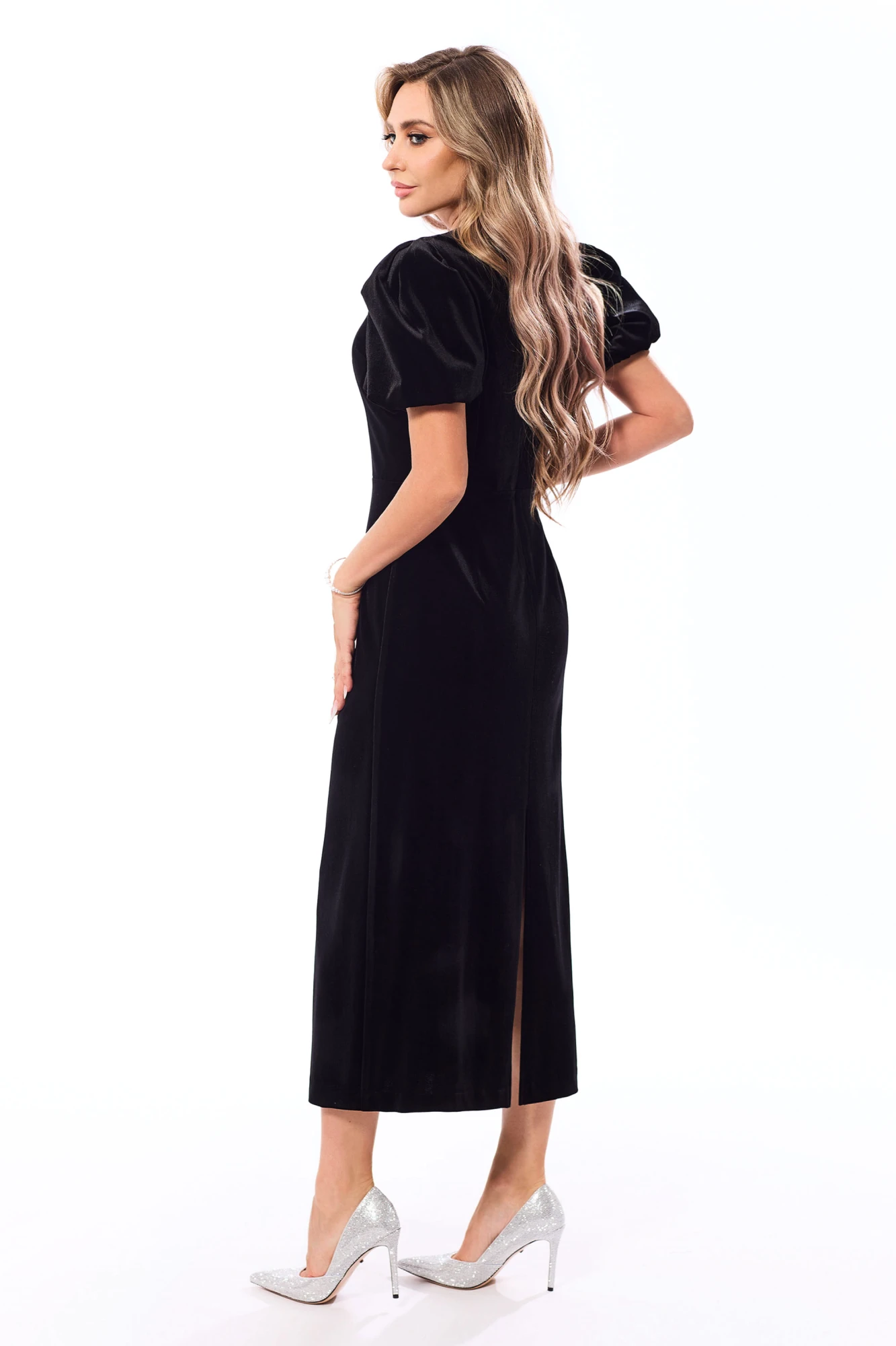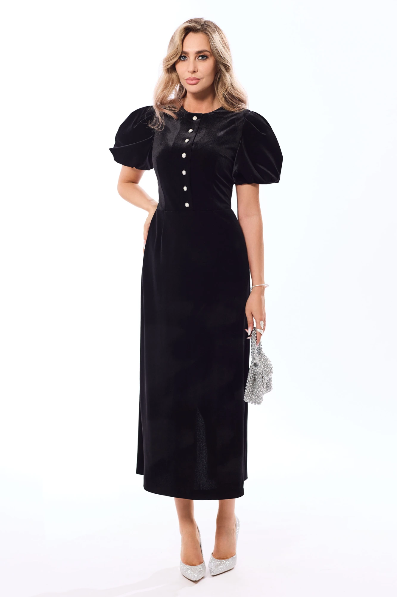 Платье без воротника, с круглым вырезом горловины, центральной застежкой на петли и пуговицы по лифу переда. Платье отрезное по линии талии. По лифу переда с нагрудными вытачками. Спинка со средним швом, заканчивающимся разрезом, талиевыми вытачками. Рукав втачной, короткий, по низу, присборен на резинку. Окат рукава присборен.