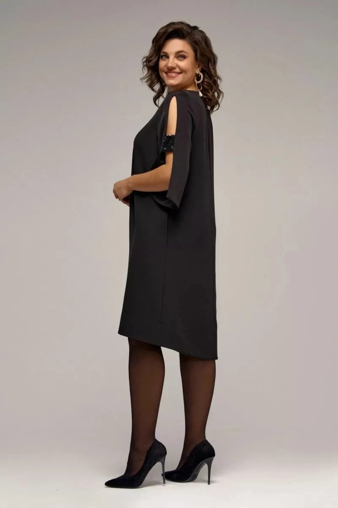 Платье, состоящее из нижнего платья и накидки из легкой шифоновой ткани с блеском. Нижнее платье полуприлегающего силуэта, без рукавов, застежка на потайную молнию по среднему шву спинки. Накидка свободного силуэта, рукава втачные, низ ассиметричной формы. Рекомендована бережная стирка при t 30; глажение при максимальной температуре прессующей поверхности утюга не более 110 С.