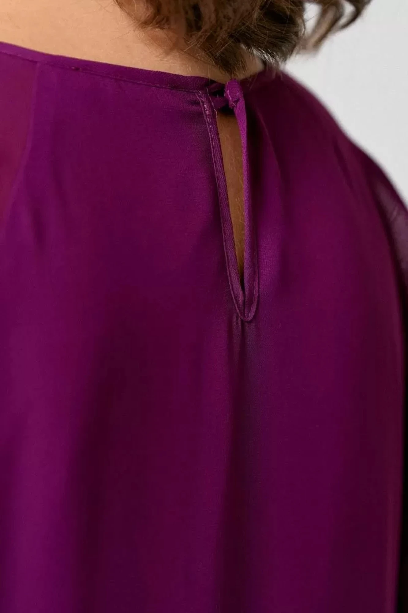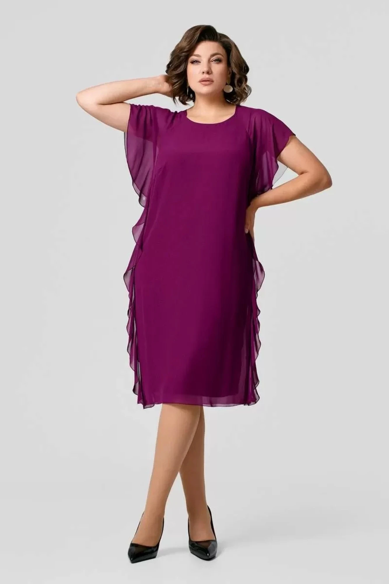 Платье женское прямого силуэта из легкой шифоновой ткани на подкладке из трикотажного полотна с антистатическим эффектом; рукава реглан, переходящие в декоративные воланы по переду и спинке. Рекомендована стирка при t не выше 30 С, глажение при t прессующей поверхности не выше 110 С.