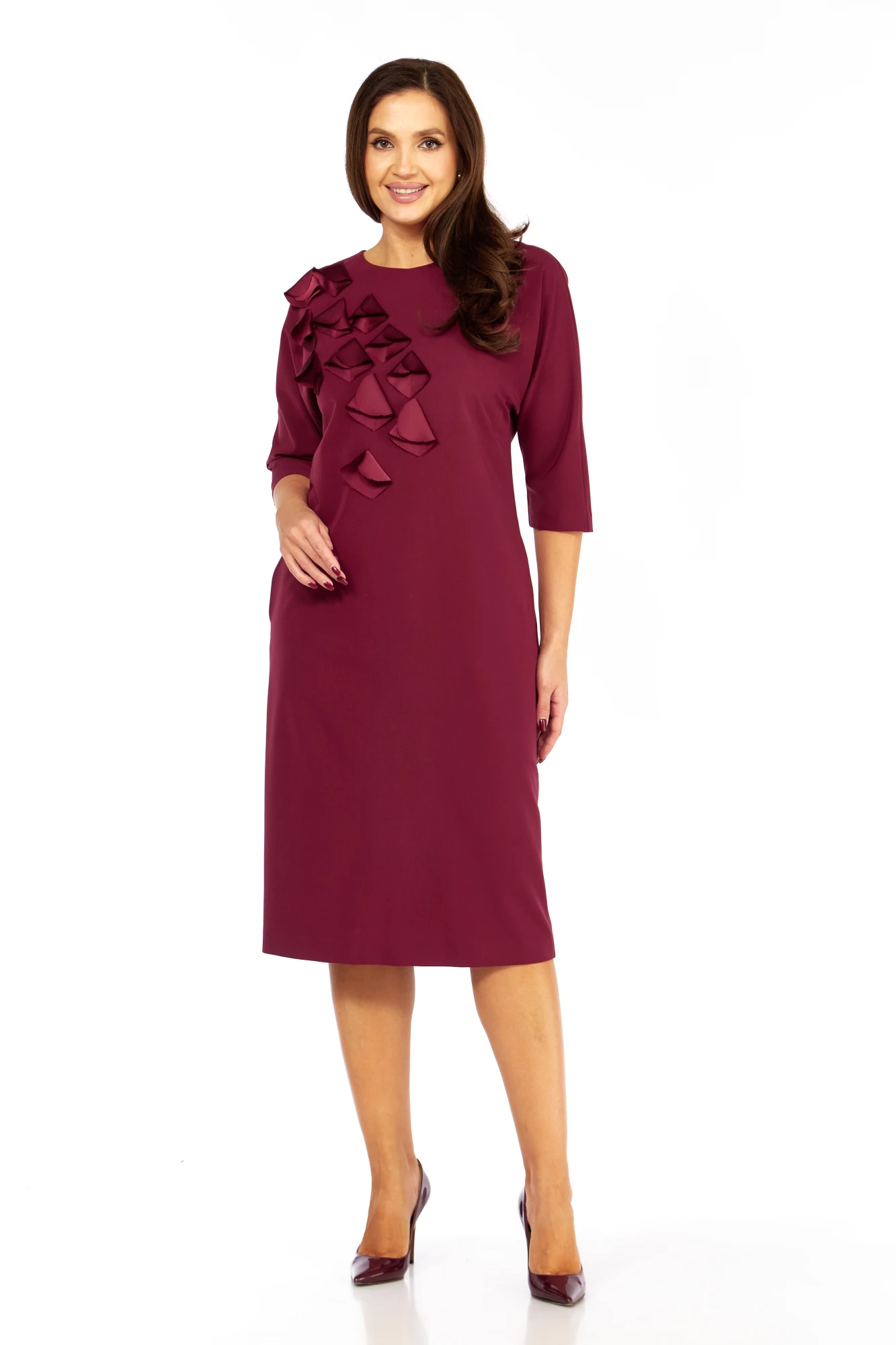 Платье выполнено из высококачественного гладкого трикотажного полотна с декоративной аппликацией из сатина в тон основной ткани. Силуэт прямой, к низу слегка зауженно; линия плеча спущена. Горловина овальная, обработана декоративной бейкой. По переду настроена аппликация в виде лепестков. Карманы в боковых швах. Рукав длиной 3/4, прямой , низ обработан бейкой. Спинка со средним швом. Платье без застёжки, без подкладки.