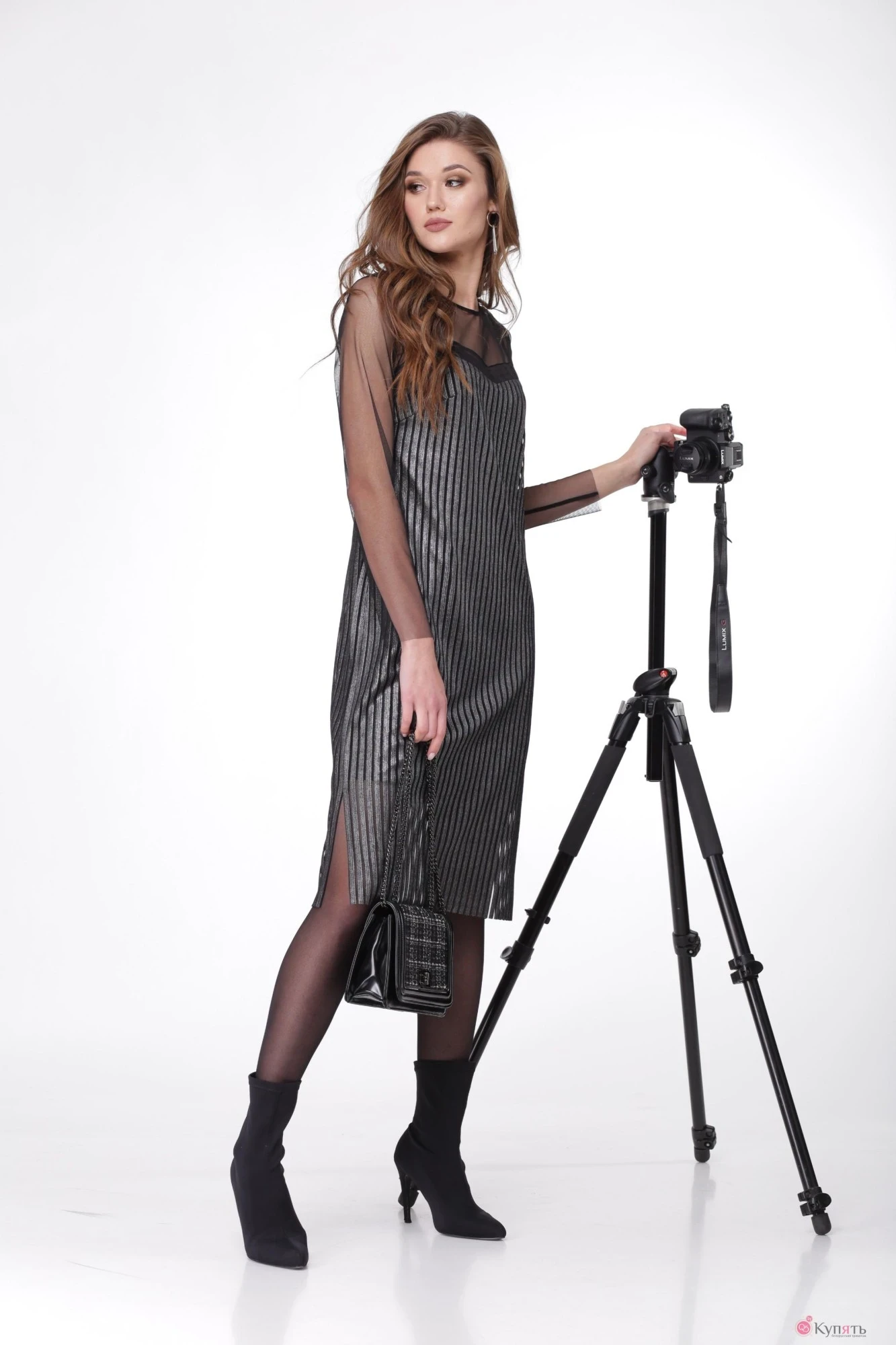 Платье женское полуприлегающего силуэта с имитацией сарафана. Платье двухъярусное. Нижний ярус выполнен из тянущейся ткани масло, верхний из легкой полупрозрачной плательной ткани. Рукав и кокетки по переду и спинки выполнены из сетки. Рукав втачной.