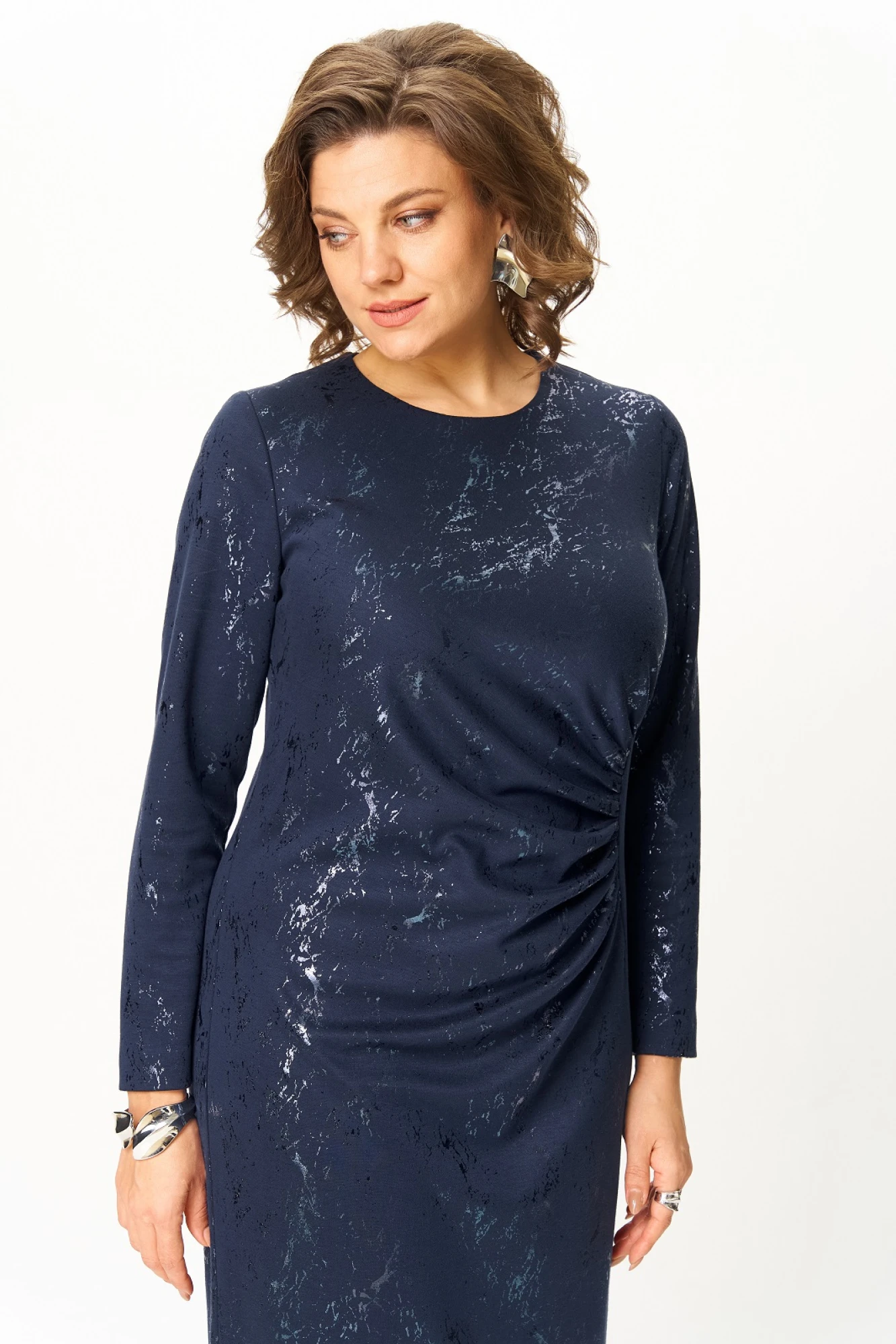 Нарядное женское платье из трикотажного полотна с добавлением вискозы. Нарядность платью придает блестящий рисунок в тон основного цвета. Силуэт прилегающий, удлиненное, по переду фигурный подрез и драпировка, вырез горловины круглый с застежкой на потайную молнию по спинке и разрезом, рукав длинный.