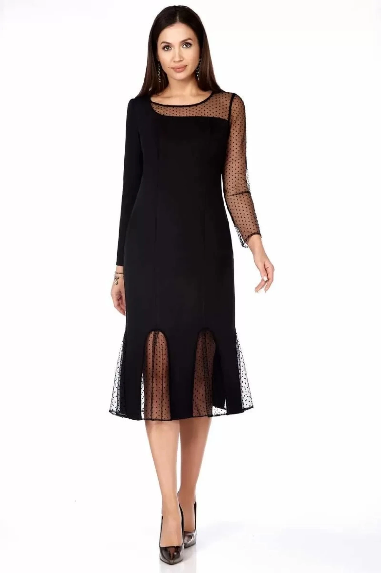 Нарядное платье годе, длина «миди». Платье элегантное, соответствующие веяниям моды. Верхняя часть платья построена на асимметрии: делать лифа и левый рукав выполнены из прозрачной ткани «мушками». Впереди рельефы от проймы, в боковом шве застежка «молния». По спинке та же асимметрия и вертикальные рельефы. Внизу по линиям швов – закругленные клинья со складочками (из прозрачной ткани), создающие силуэт годе. Рукав длинный. Силуэт платья подчеркивает фиругу.