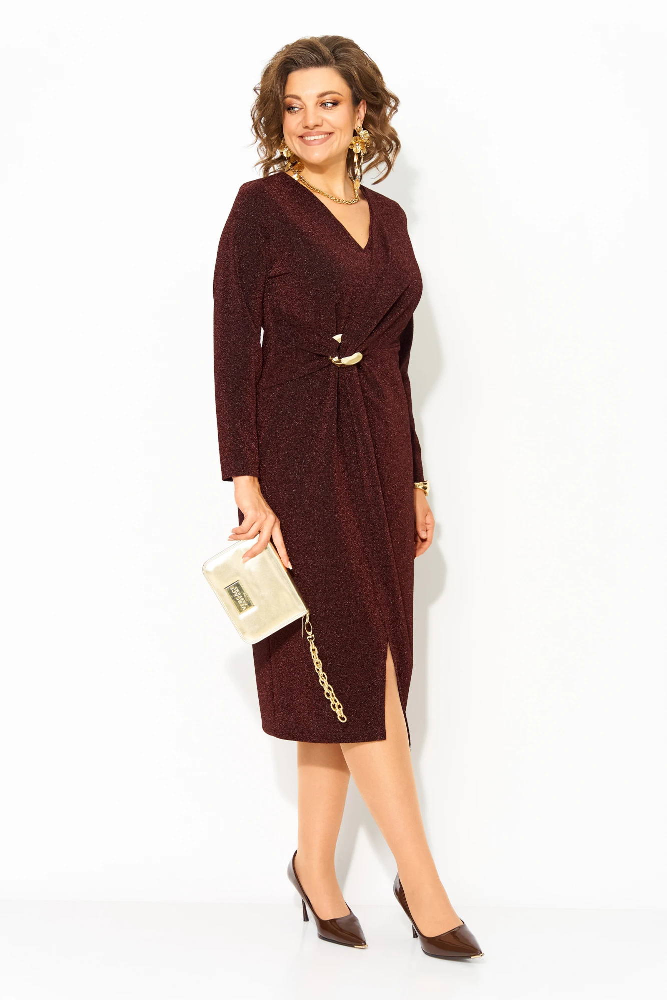 Эффектное вечернее платье с драпировкой подчёркивает фигуру, выгодно обтягивая силуэт и создавая элегантный образ. V-образный вырез добавляет нотку соблазна, а разрез придаёт образу лёгкости и уверенности. Это женское платье — идеальный выбор на вечер, если вы хотите выглядеть ярко, стильно и женственно. Идеально садится по фигуре, подчёркивает талию и визуально вытягивает силуэт. Скрывает все недостатки, подчеркивая лишь достоинства. Гладкий и мягкий с изнанки трикотаж, сверху с эффектом мерцания. Хит продаж 2025-26 года.
