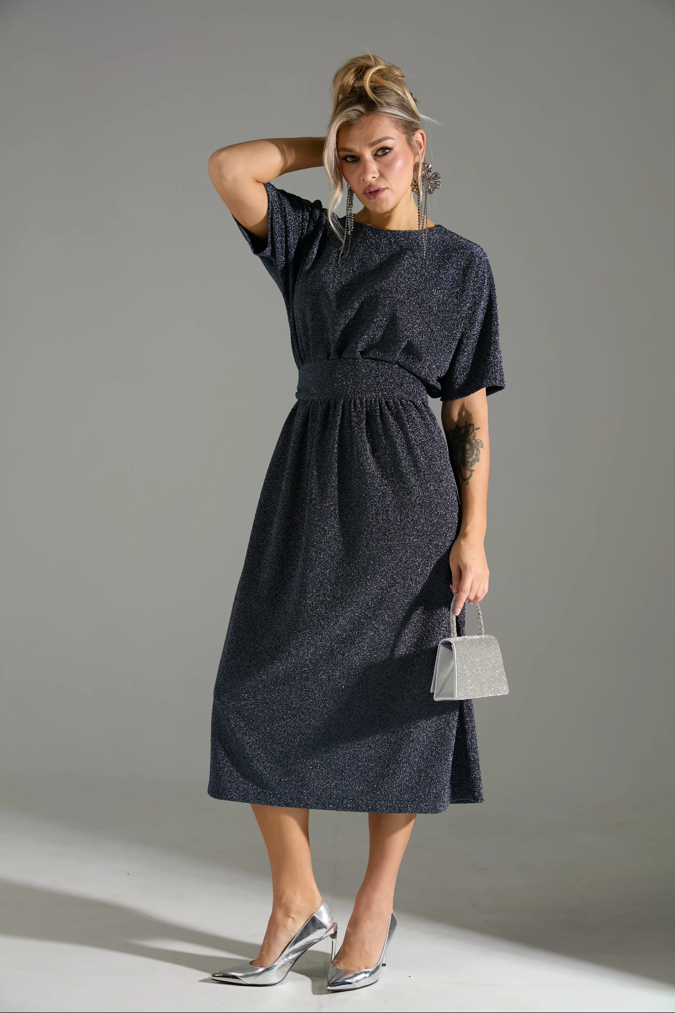 Платье длины миди со свободной юбкой и пришивным по переду поясом. Рукав цельнокроеный. По спинке встречные складки и застёжка по линии горловины на пуговицу.