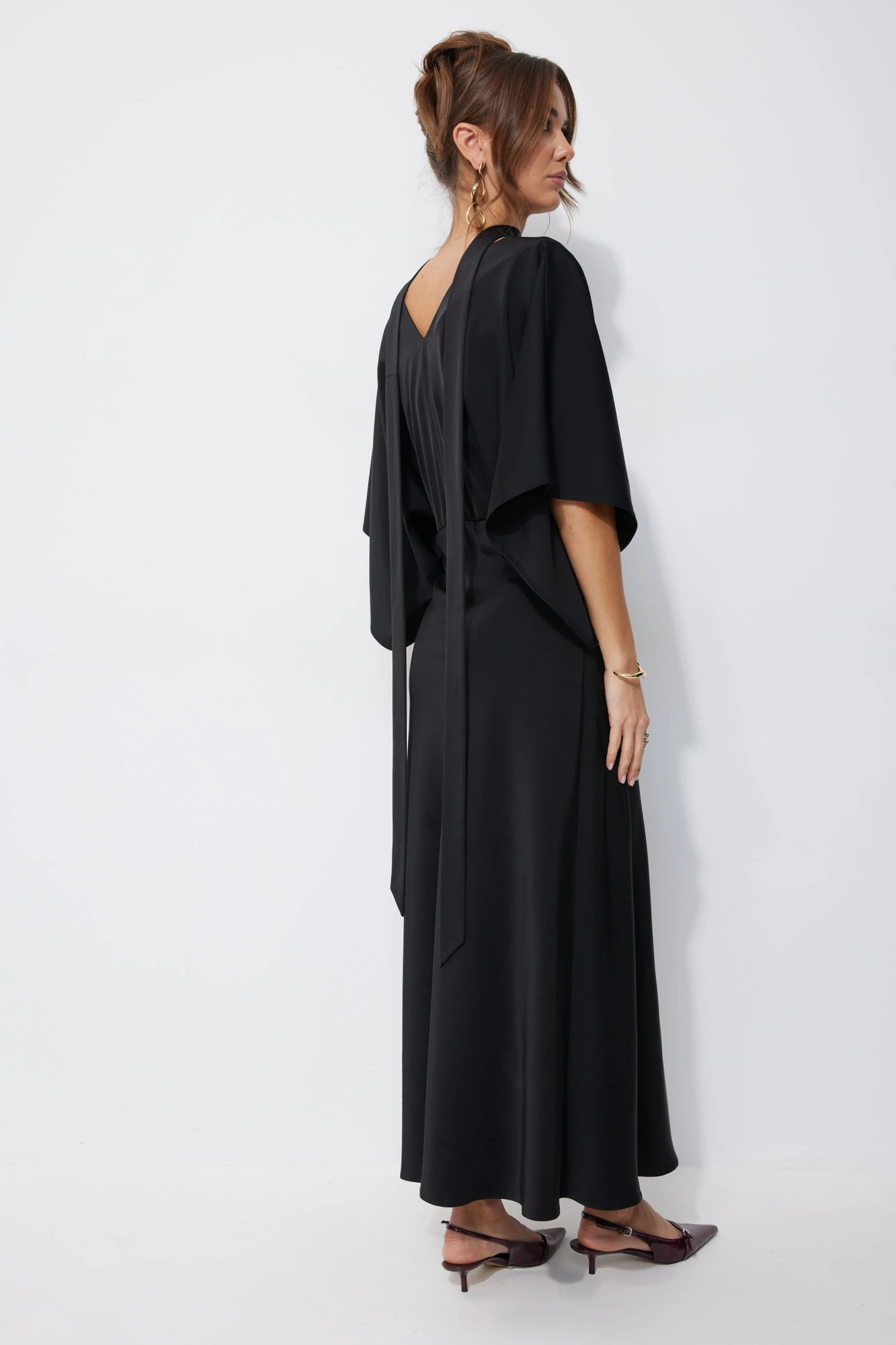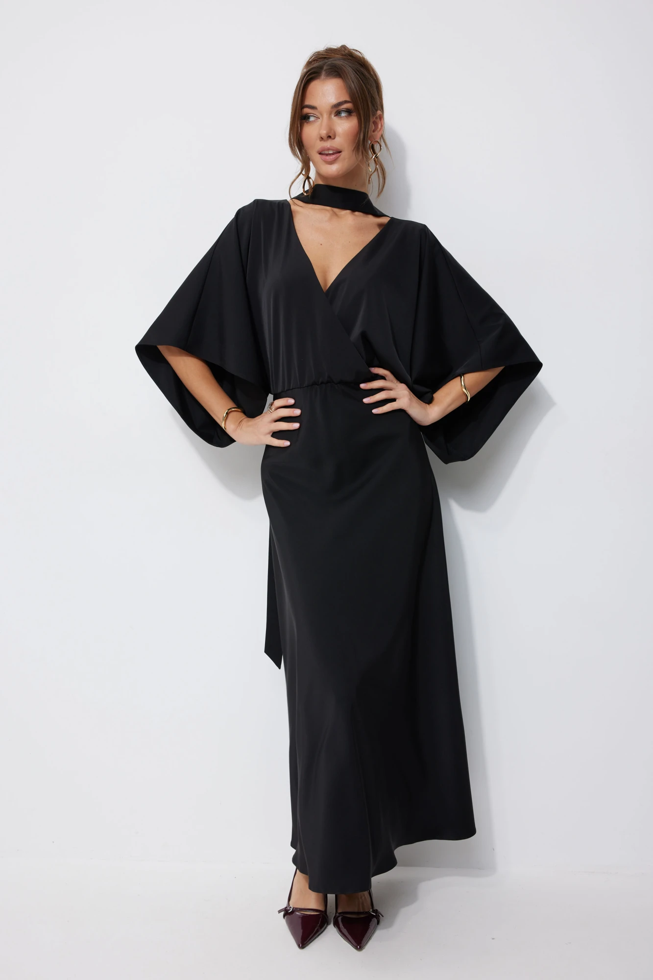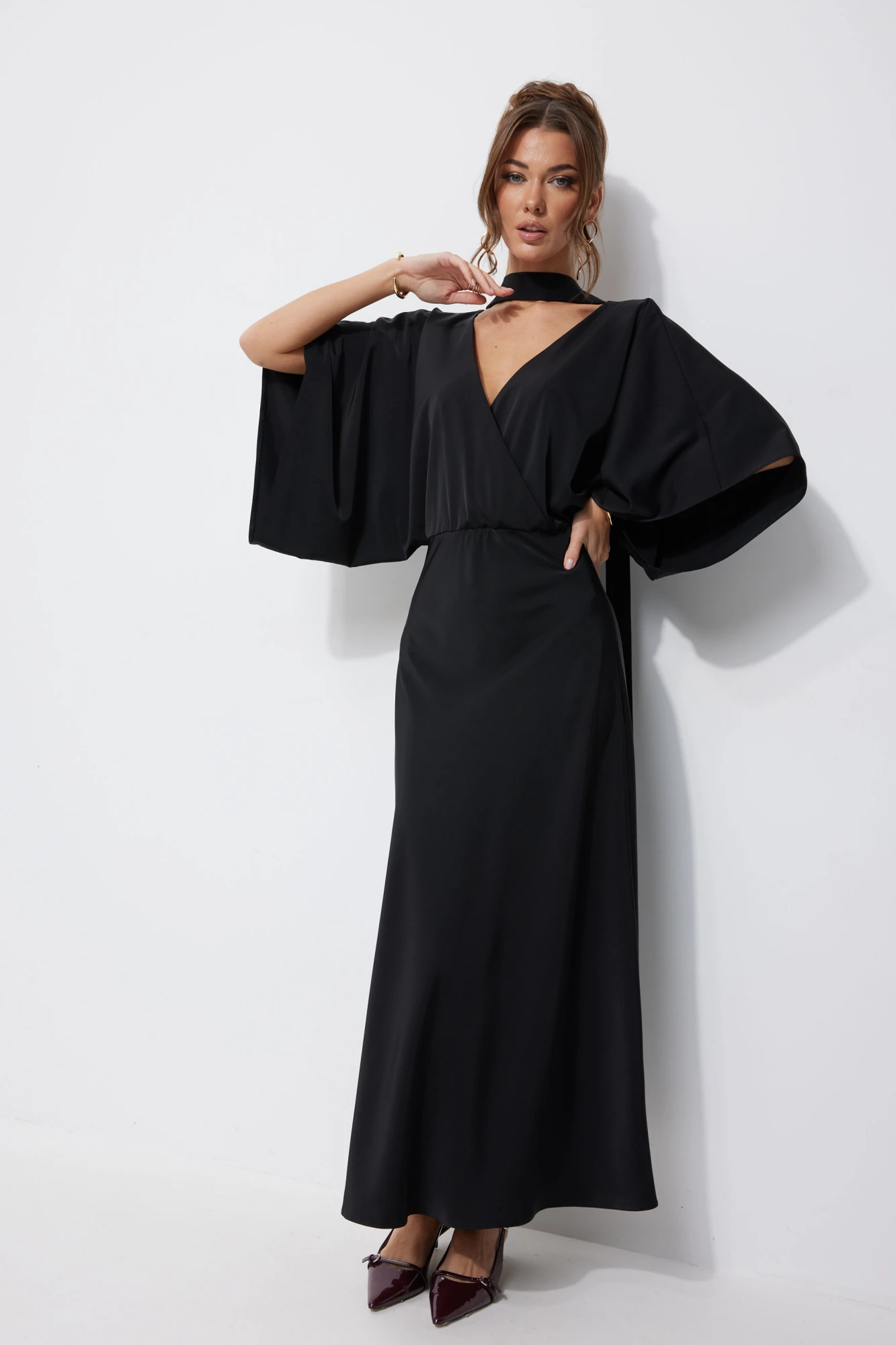 Нарядное платье из струящейся ткани, длина макси. Платье полуприлегающего силуэта. Отрезное по линии талии, с резинкой. По переду запах. По спинке глубокий V-образный вырез горловины. Рукав цельнокроеный, расширенный, длина немного ниже линии локтя. Юбка покроена по косой, силуэт расширяется к низу. Платье дополняется мягким поясом из основной ткани. Его можно использовать, как шаль, повязав на шею, либо, как пояс - на талию.