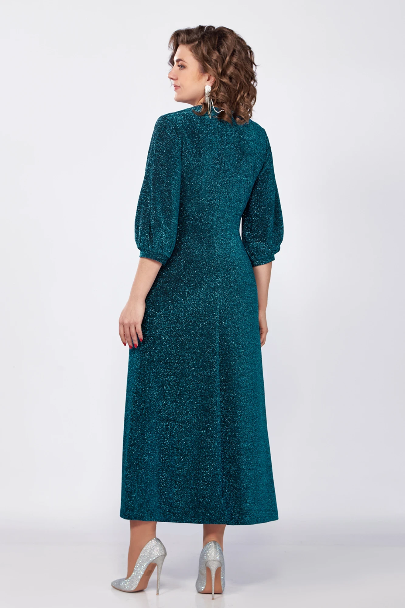 Эффектное платье прилегающего силуэта, выполнено из трикотажной люрексовой ткани. Горловина платья V-образной формы, окантована, по линии талии выполнен декоративный элемент с сборкой и подрезом, переходящим в разрез по низу. Рукав втачной, с эффектным разрезом по середине, по низу рукав присборен на манжет. Спинка с средним швом, по силуэту расклешенная к низу. Платье очень роскошно садиться по фигуре благодаря эластичности ткани, а благодаря эффектным конструктивным элементам подчеркивает достоинства фигуры и удачно скрывает недостатки. В нем вы будете чувствовать себя королевой!