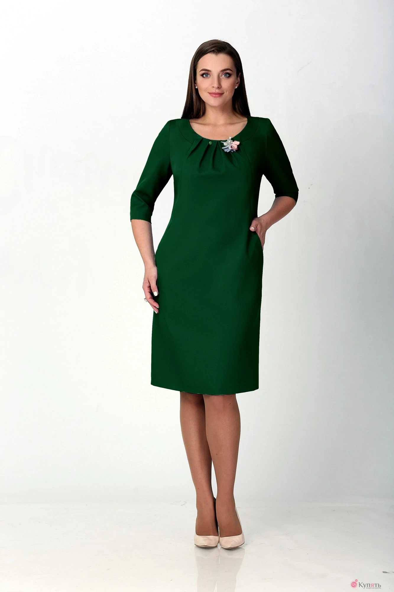 Силуэт платья полуприлегающий, рукав втачной. По центральной части переда, в области горловины, заложены складки, съемное украшение (может меняться).В рельефных швах переда карманы. Спинка с потайной молнией в среднем шве, понизу разрез.