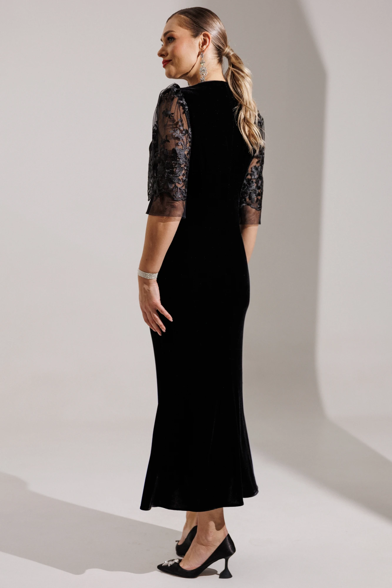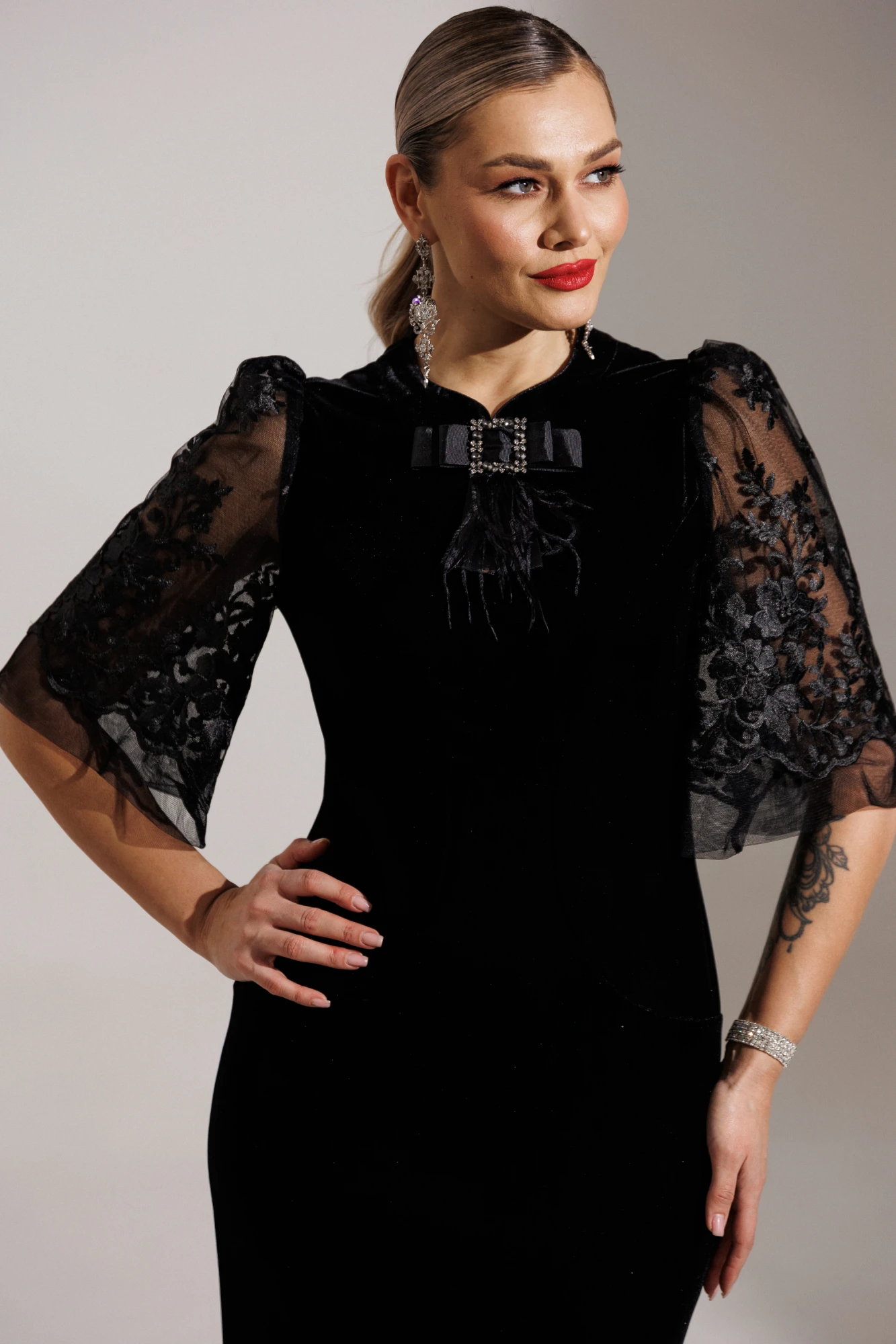 Новинка от бренда Мода-Юрс - велюровое платье в тандеме с гипюром. Черный цвет в одежде - символ утонченности и роскоши. Платье подчеркивает женственные линии фигуры и не оставит шанса не влюбиться! Платье полуприлегающего силуэта с рельефами по переду и талиевыми вытачками по спинке. Рукав втачной, по окату со сборкой, к низу расширен. По переду платье со стойкой, которая застегивается на навесную петлю и пуговицу и на крючок внутри.
