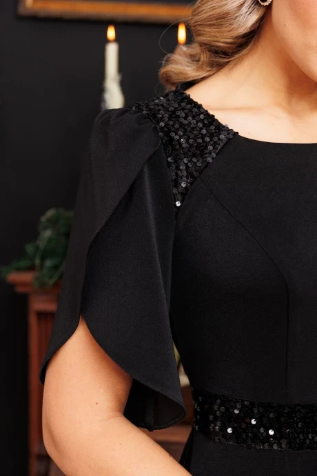 По переду платье с отрезными кокетками, которые выполнены из ткани в пайетки.