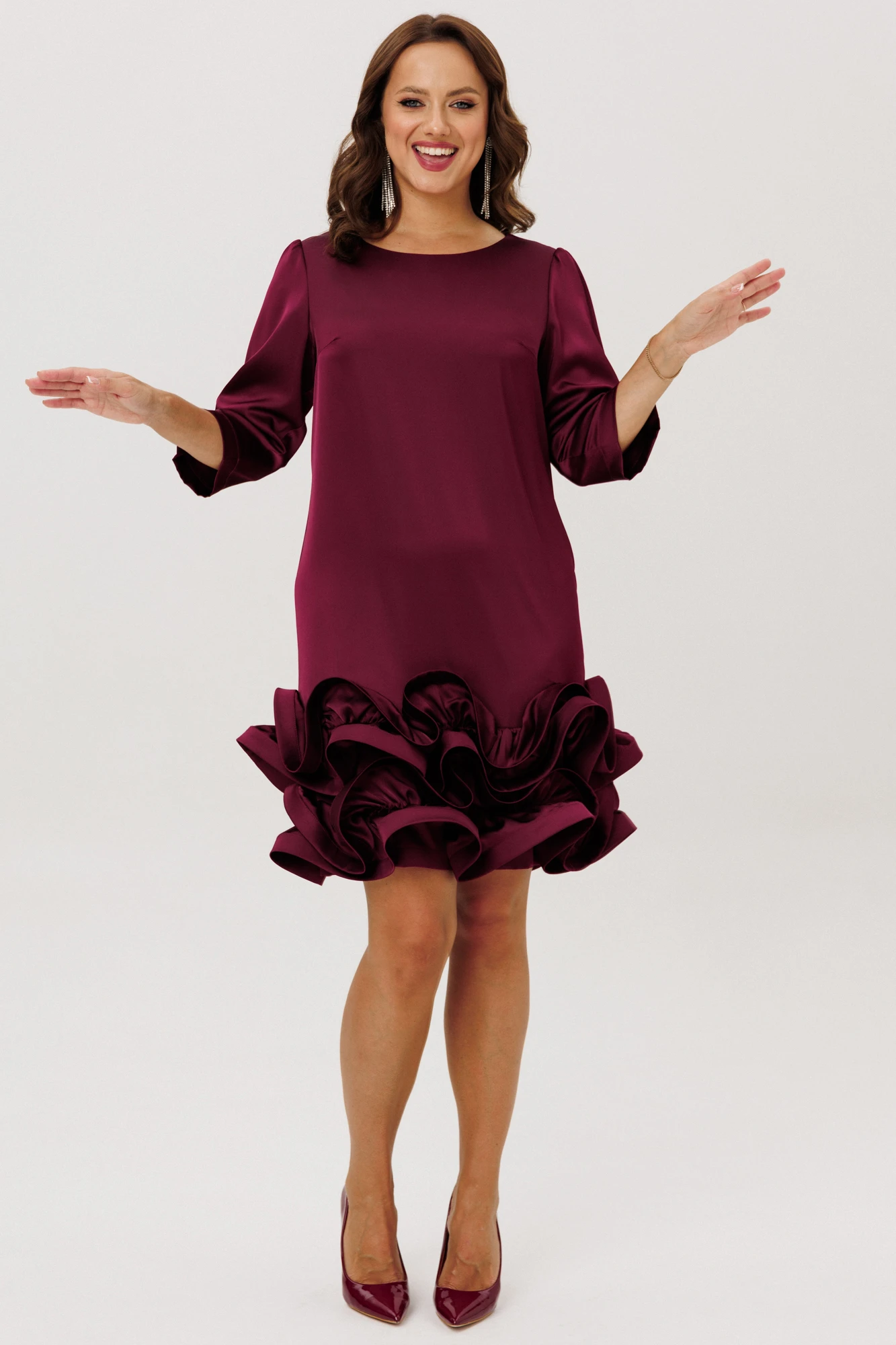 Нарядное платье полуприлегающего силуэта, выполненное из струящегося шелка «Армани» (немного тянется), без подкладки. По переду нагрудные вытачки. По спинке средний шов с застежкой на навесную петлю-пуговицу. Горловина округлой формы. Рукава втачные одношовные со сборкой по окату, встречной складкой и отделочной пуговицей по низу. Низ платья оформлен двумя присборенными воланами, края которых обработаны специальной тесьмой для придания формы изгибов воланам ( тесьма мягкая, подвижная).